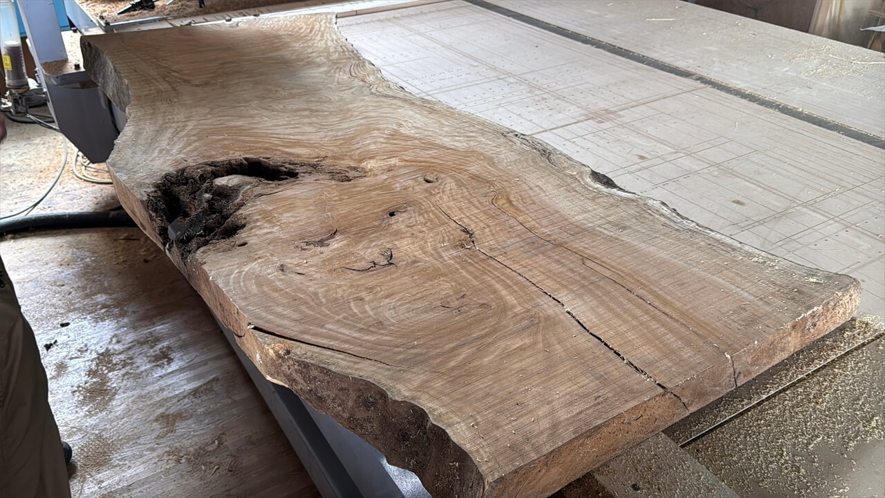 下の画像は仕上げ前のケヤキ一枚板になります。ここから両面を削って平らにしたり耳の仕上げやトリミングして形を整えて仕上げていきます。