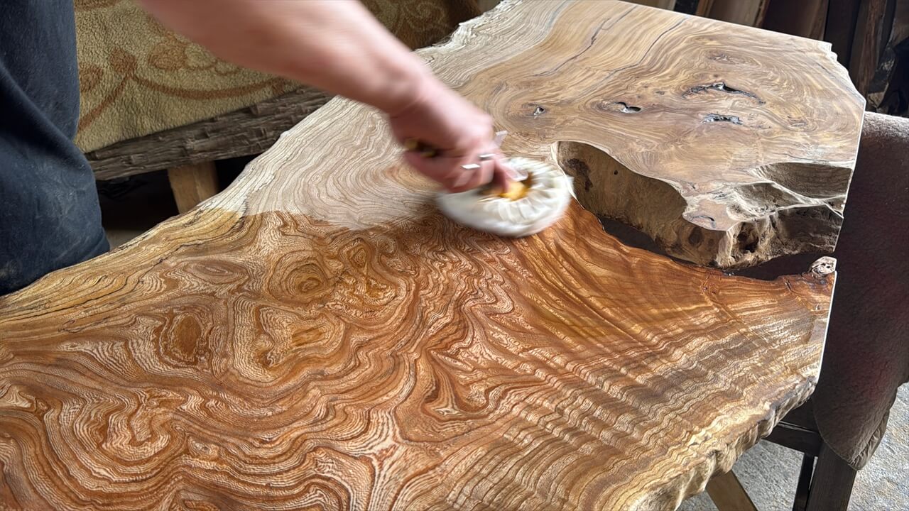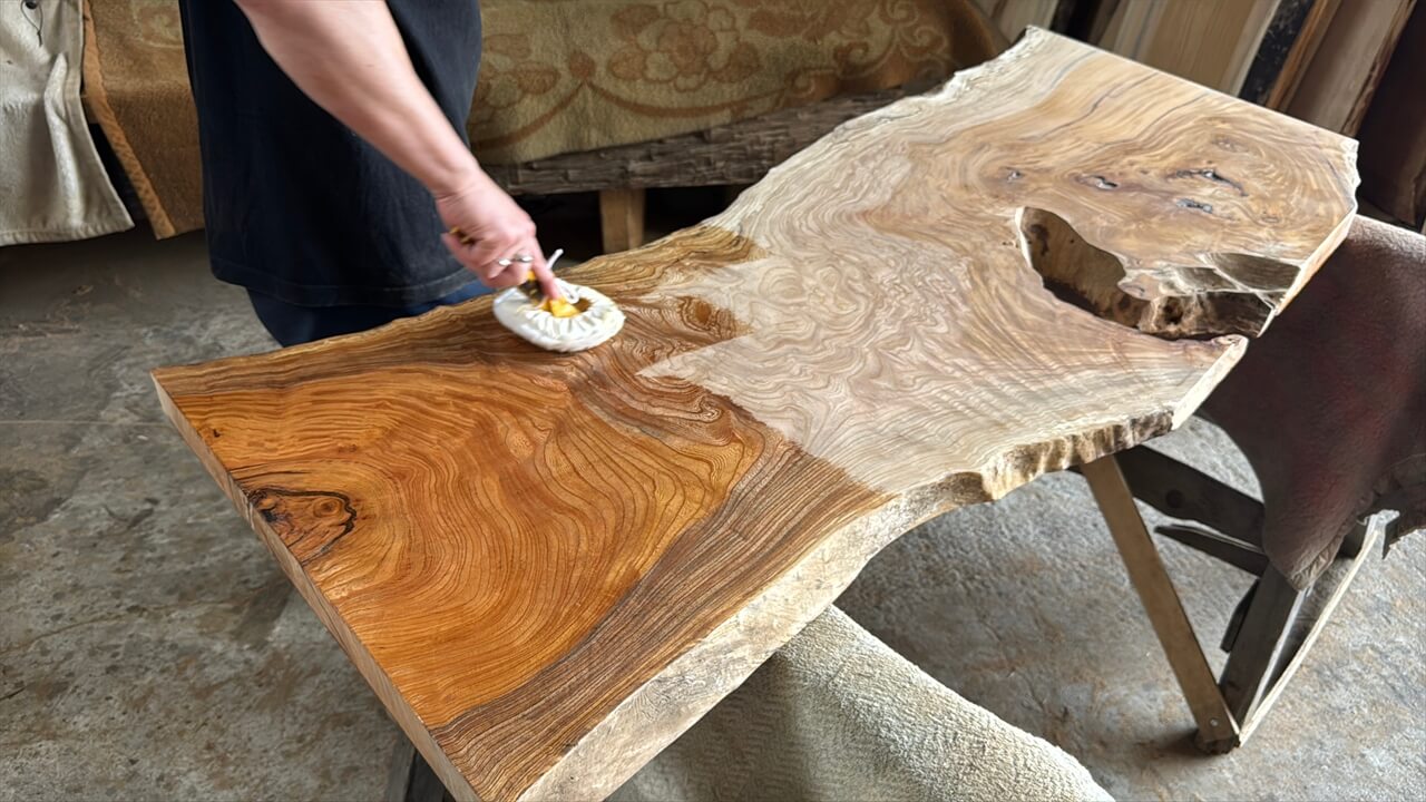 こちらのケヤキ一枚板をオイル塗装しながら紹介している動画です。ぜひご覧ください。↓