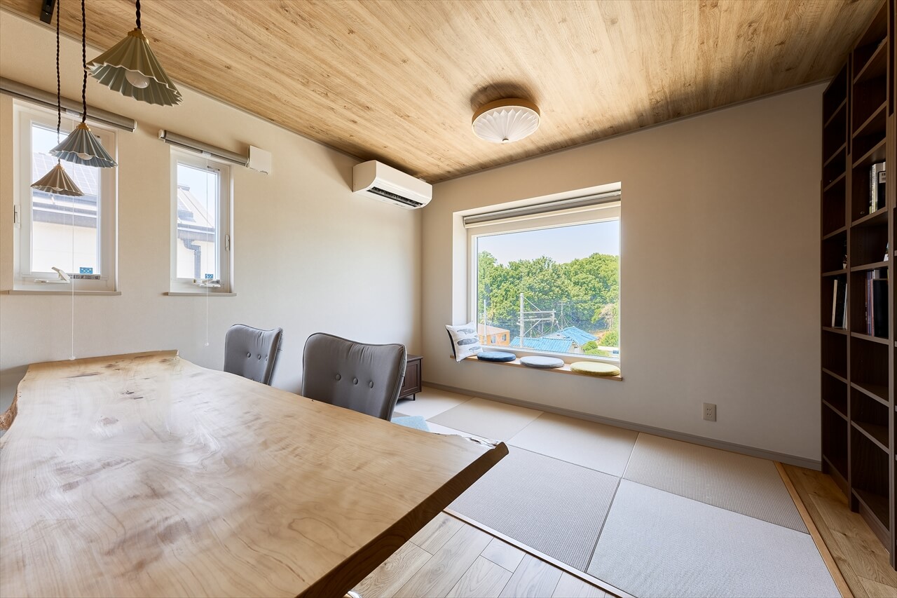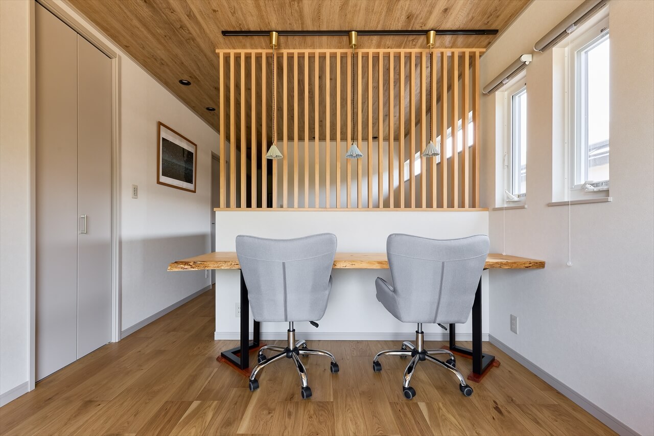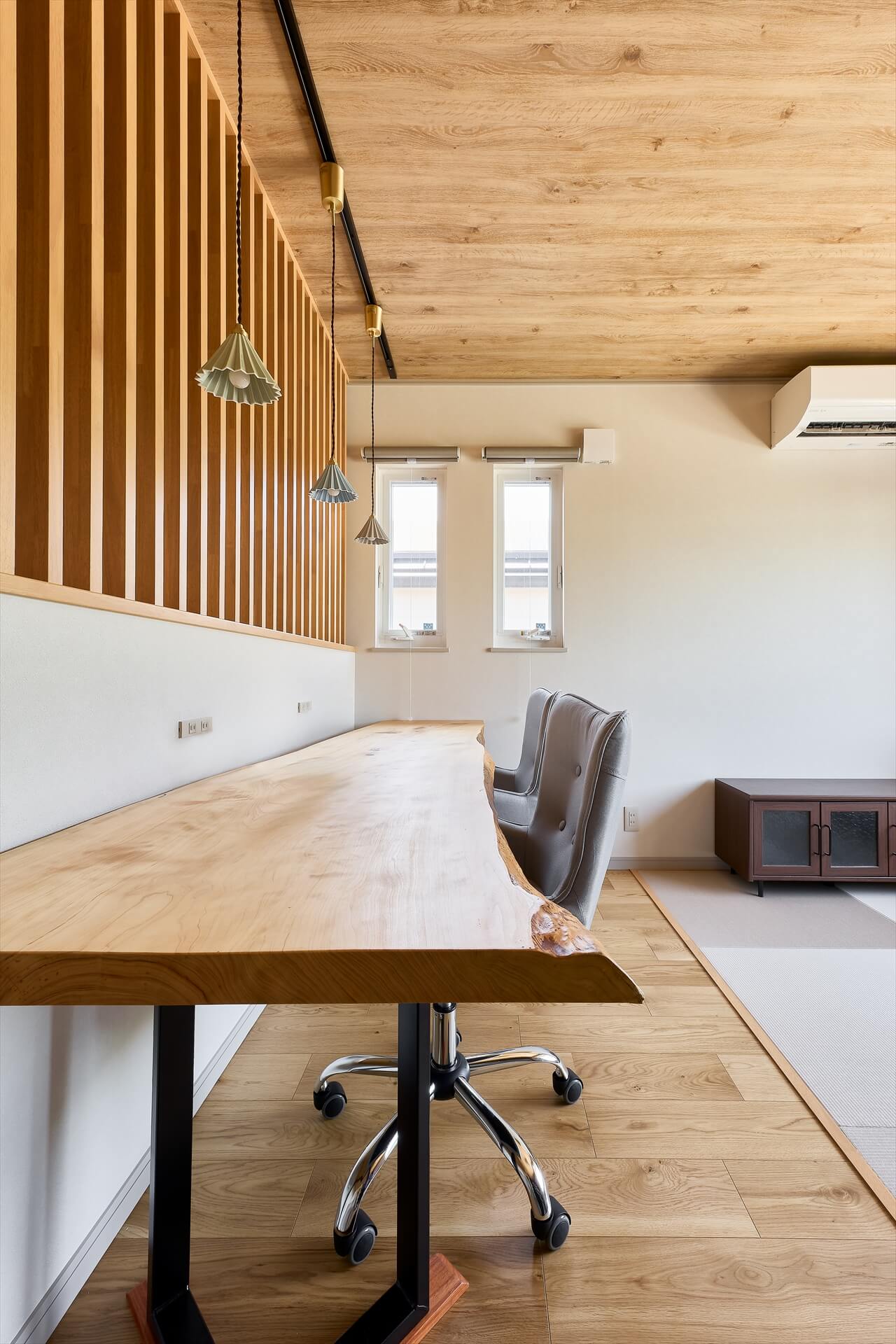 リモートワークデスクや子どものスタディースペースとして使っていきますが、虫穴の跡なども含め、自然な風合いが良いアクセントになり、仕事や勉強の合間にリラックスできる空間になったと思います。