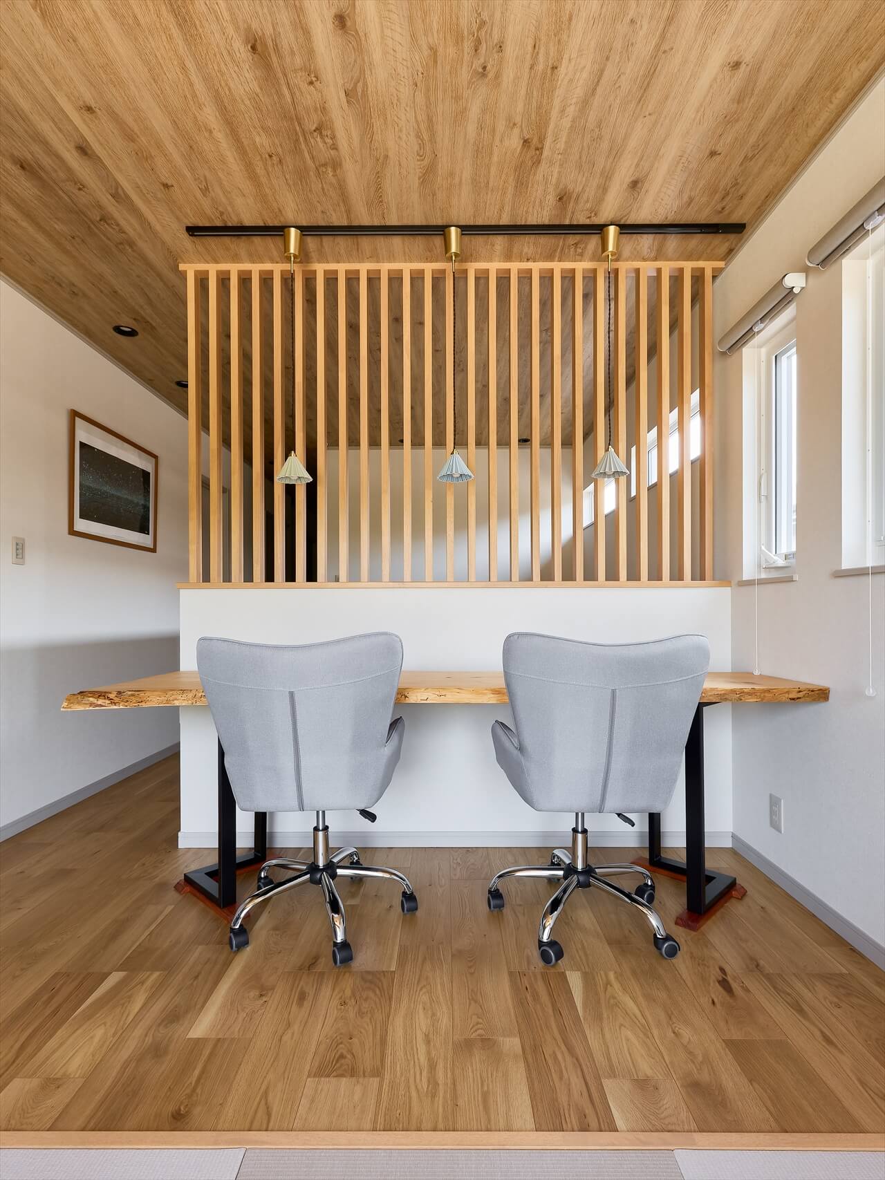 リモートワークデスクや子どものスタディースペースとして使っていきますが、虫穴の跡なども含め、自然な風合いが良いアクセントになり、仕事や勉強の合間にリラックスできる空間になったと思います。