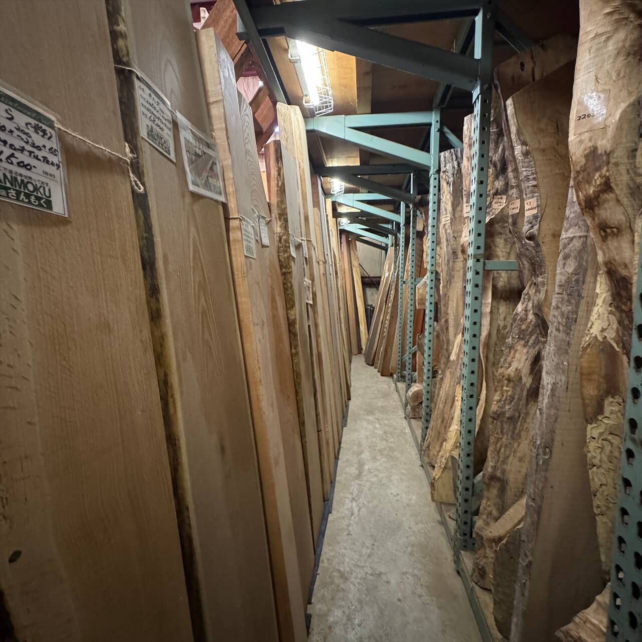 もともとは仕上がる前の板を保管する倉庫だったため、今もところどころに乾燥中の素材荒木があります。まだ仕上がっておらず、ホコリをかぶった姿ですが、同業の方や家具職人さん、工務店さん、大工さんなどには、この状態から加工する素材として人気です。