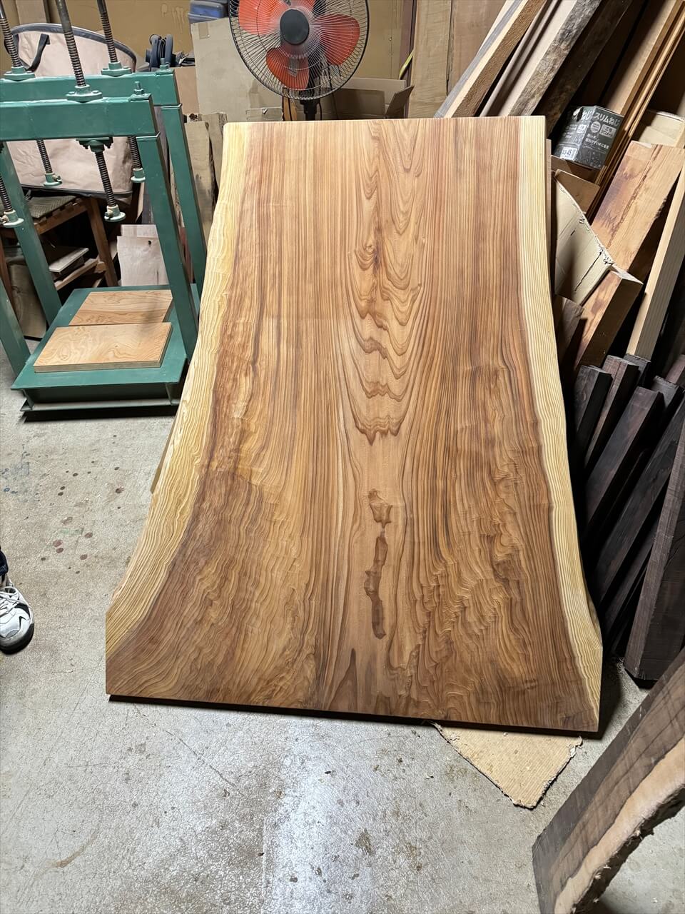 こちらがお客様にお選びいただいた秋田産の杉の一枚板です。切り株特有の“末広がり”が魅力の、表情豊かな板です。↓