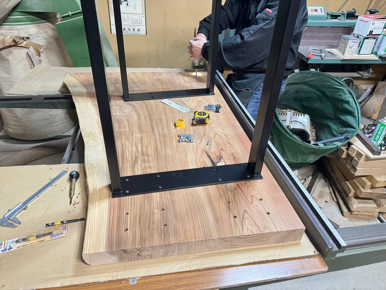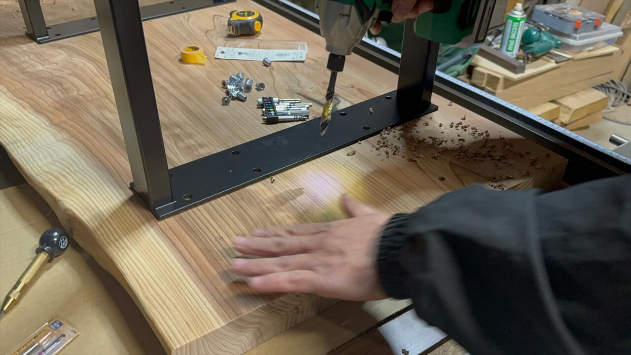 天板にアイアン脚を取り付ける加工です。脚はボルトで固定して、取り外しができるようにします。