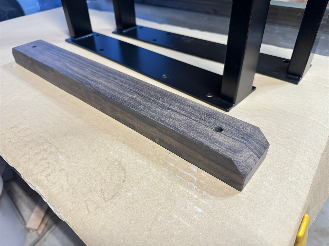 アイアン脚の下部に取り付けるのは、業界では昔からシャム柿といわれている黒柿に似た材で、ゼリゴテ、ジリコテという中南米産の銘木になります。↓