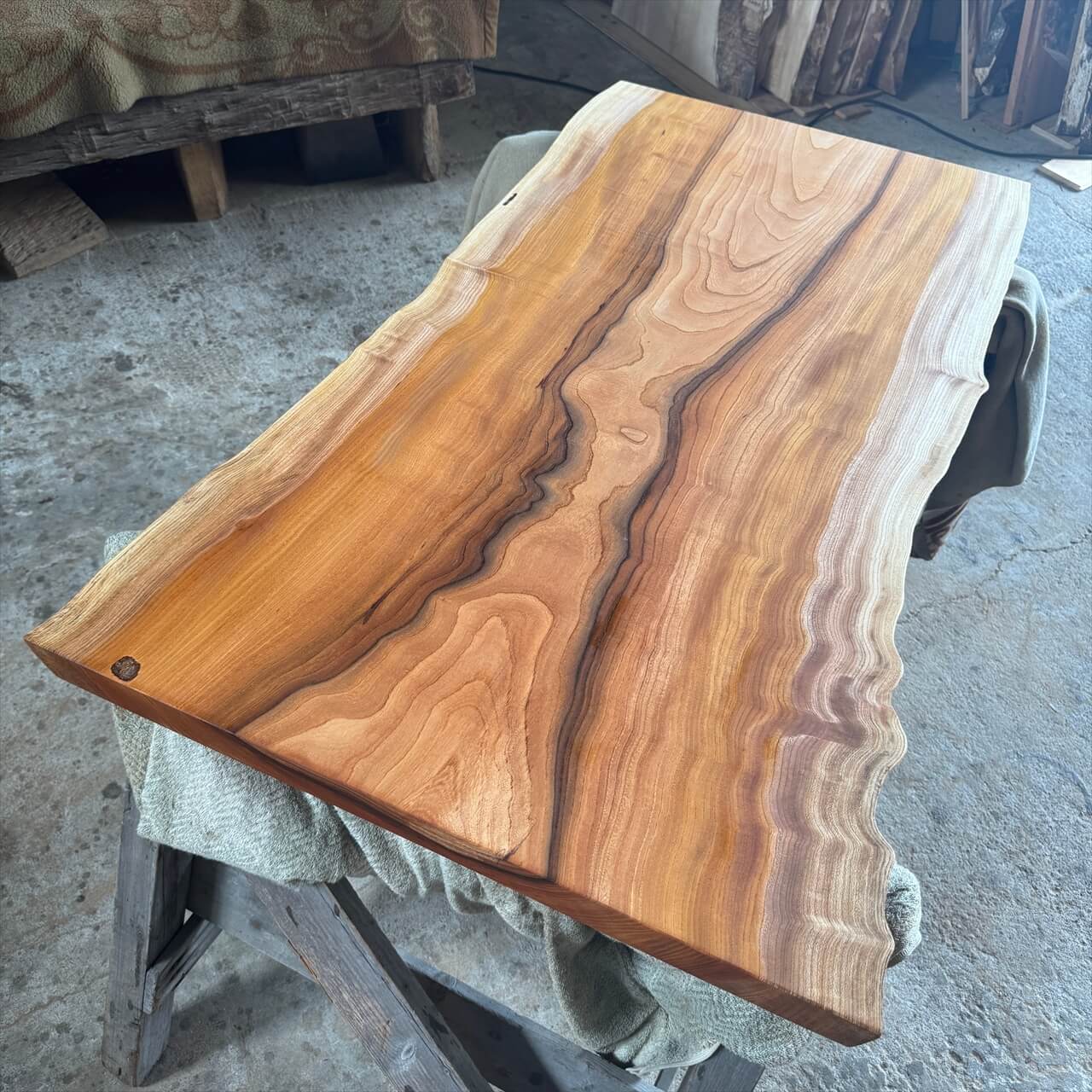 送っていただいた欅の一枚板、木表はもちろんですが、裏面も素晴らしいため、当初の予定通りビス穴をあけずに使うことにしました。