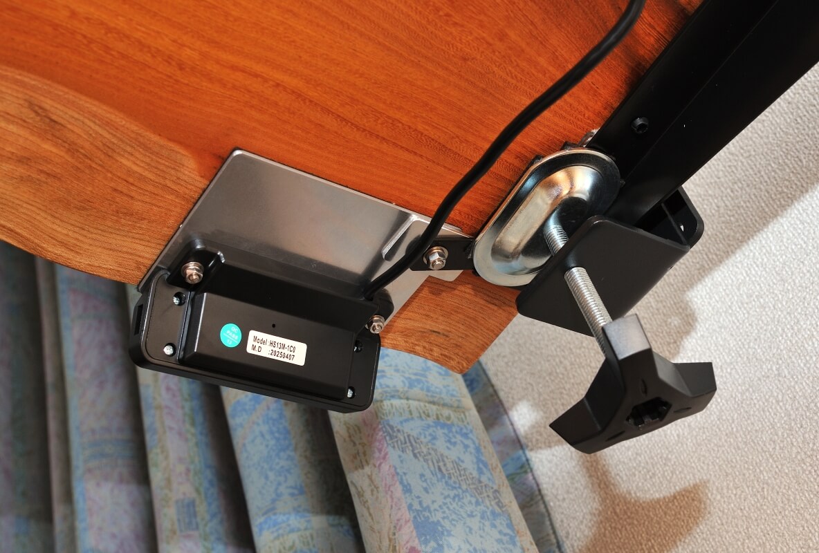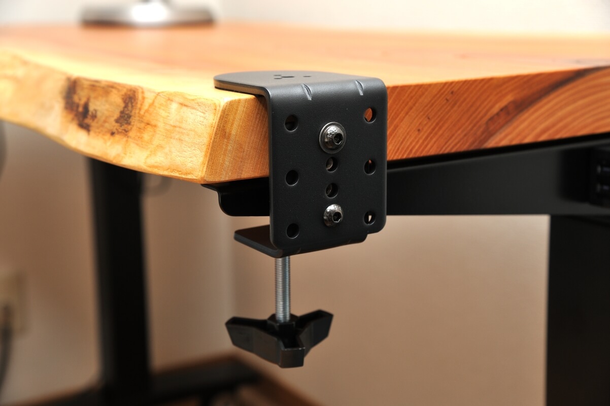 一緒に送っていただいたクッション材も使わせていただき、結構安定しているようなのですが、やはり置くだけでは昇降を繰り返すうちにずれてくるのではという不安があり、以前近江様から伺った、天板をクランプで固定して使っているお客様の話を参考にさせていただいて、私もそれに倣うことにしました。