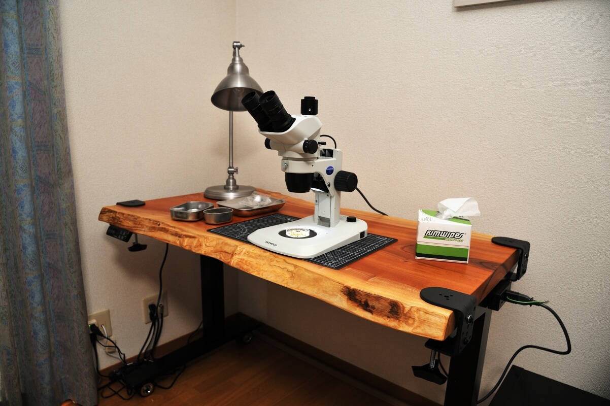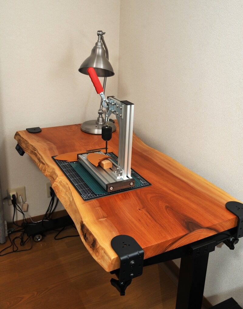 自動昇降アイアン脚の取り付けに際して、一枚板を”加工跡を付けずにきれいな状態に保ちたい”という思いが行動となり、今回こんなに素敵な作業デスク完成されたことに、私もとても感動しております。