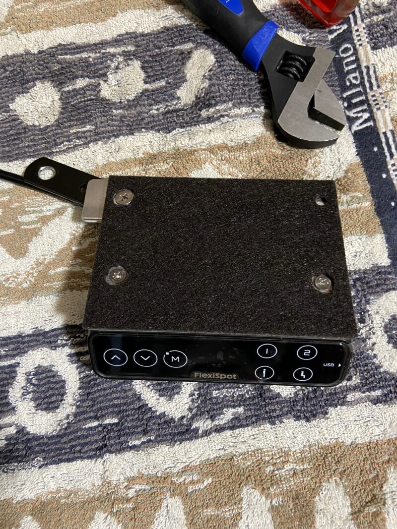 コントローラーを取り付けるアルミ金具は、上面(天板側)の穴を皿もみして皿ネジを使用し、さらに2.5ミリ厚のフェルトを貼って天板を保護。