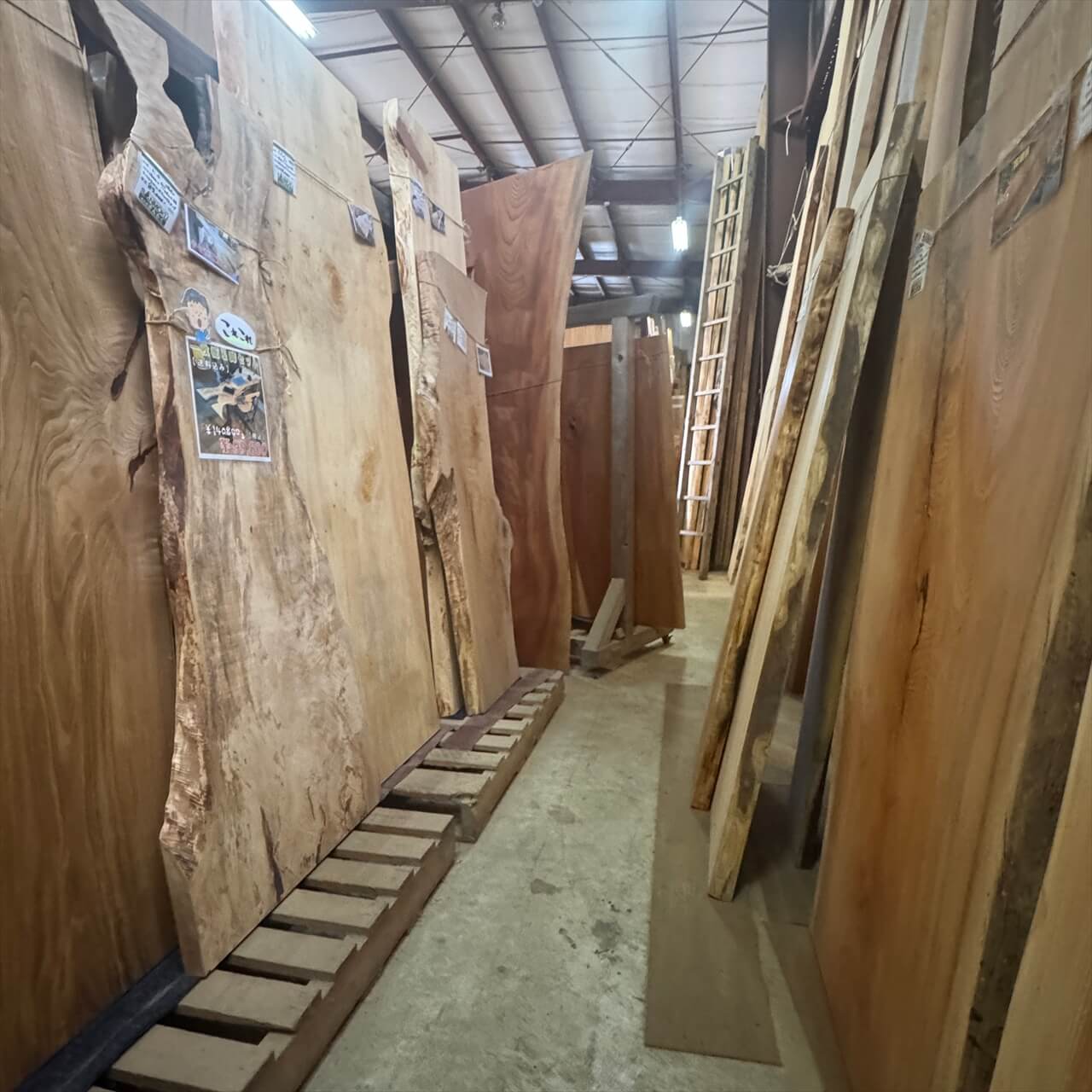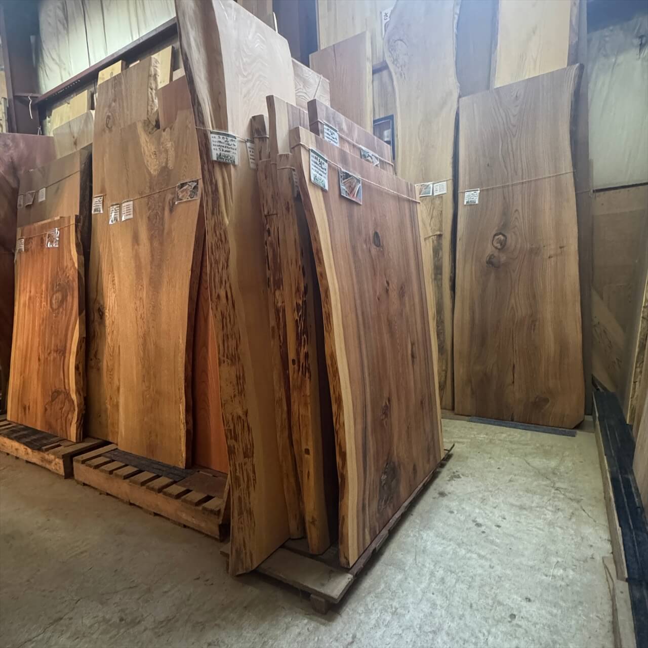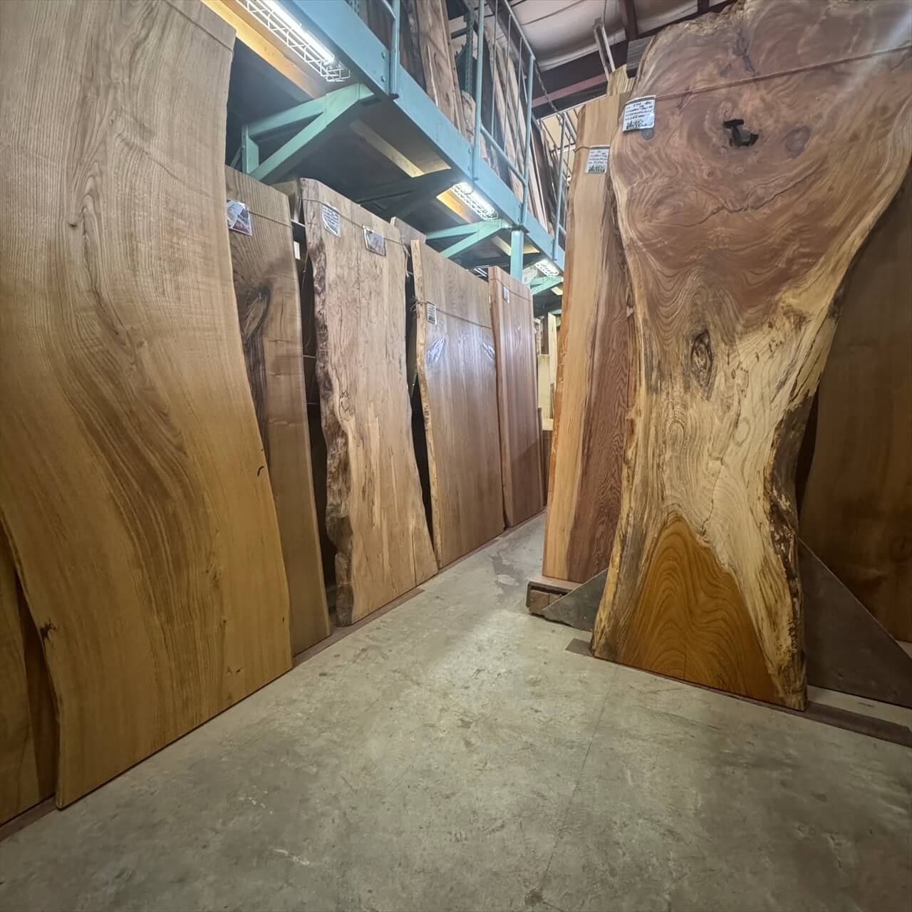 展示倉庫には、店主がみずから選び抜いた「グッとくる」数百枚の一枚板を常時展示・販売しております。
