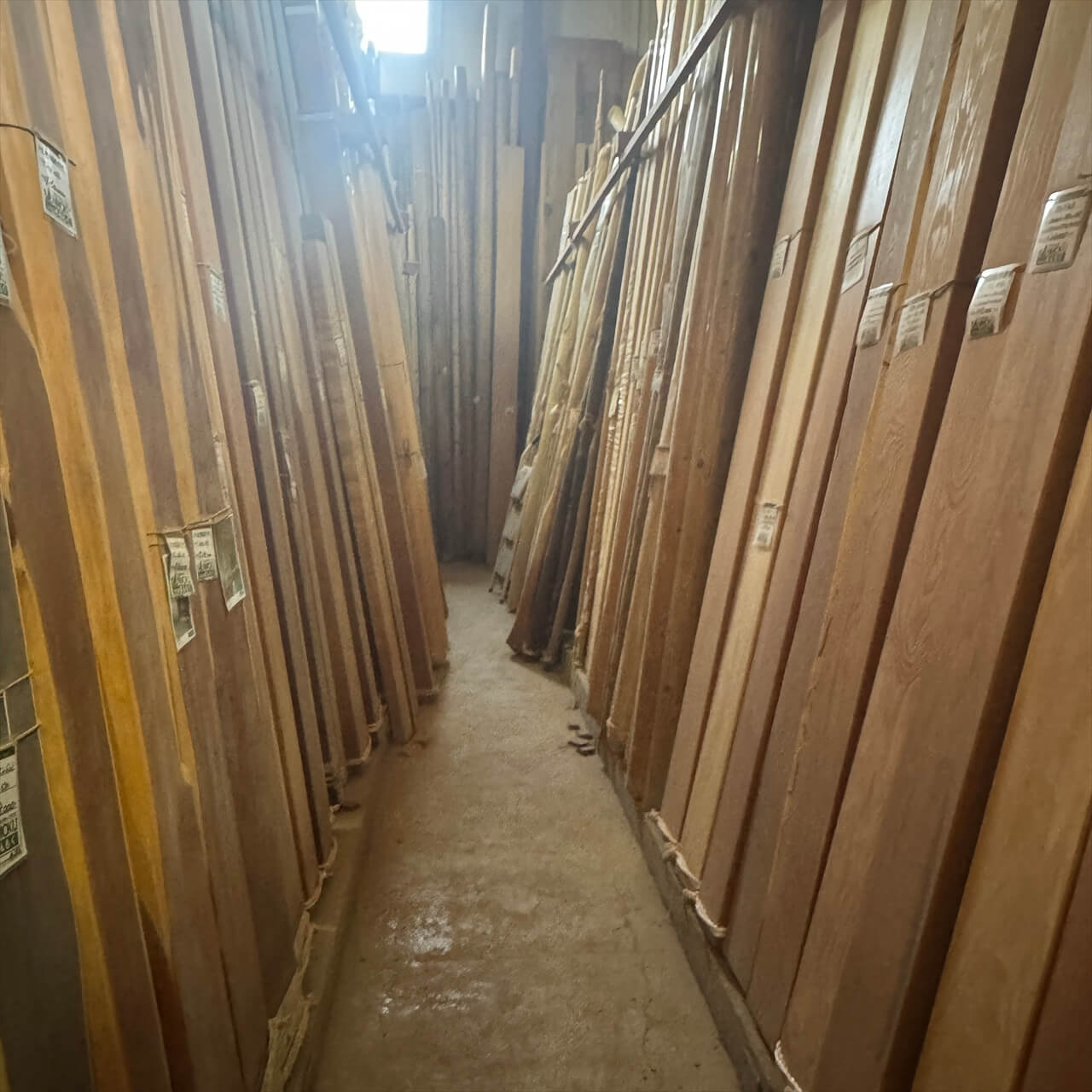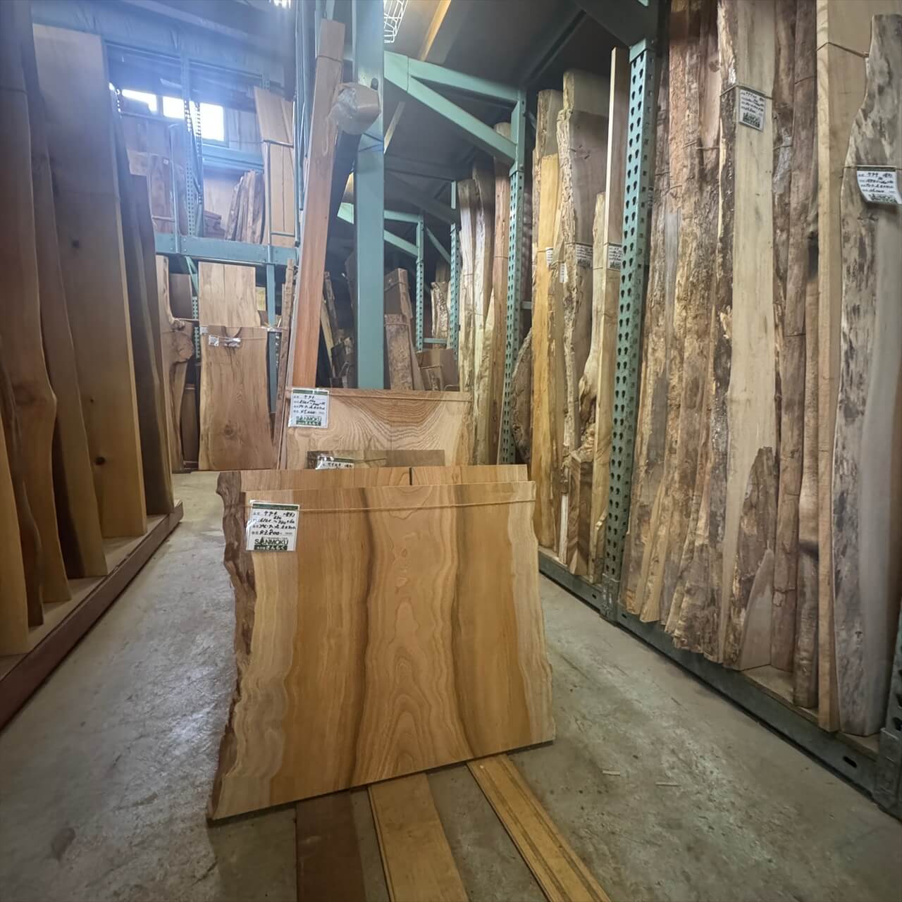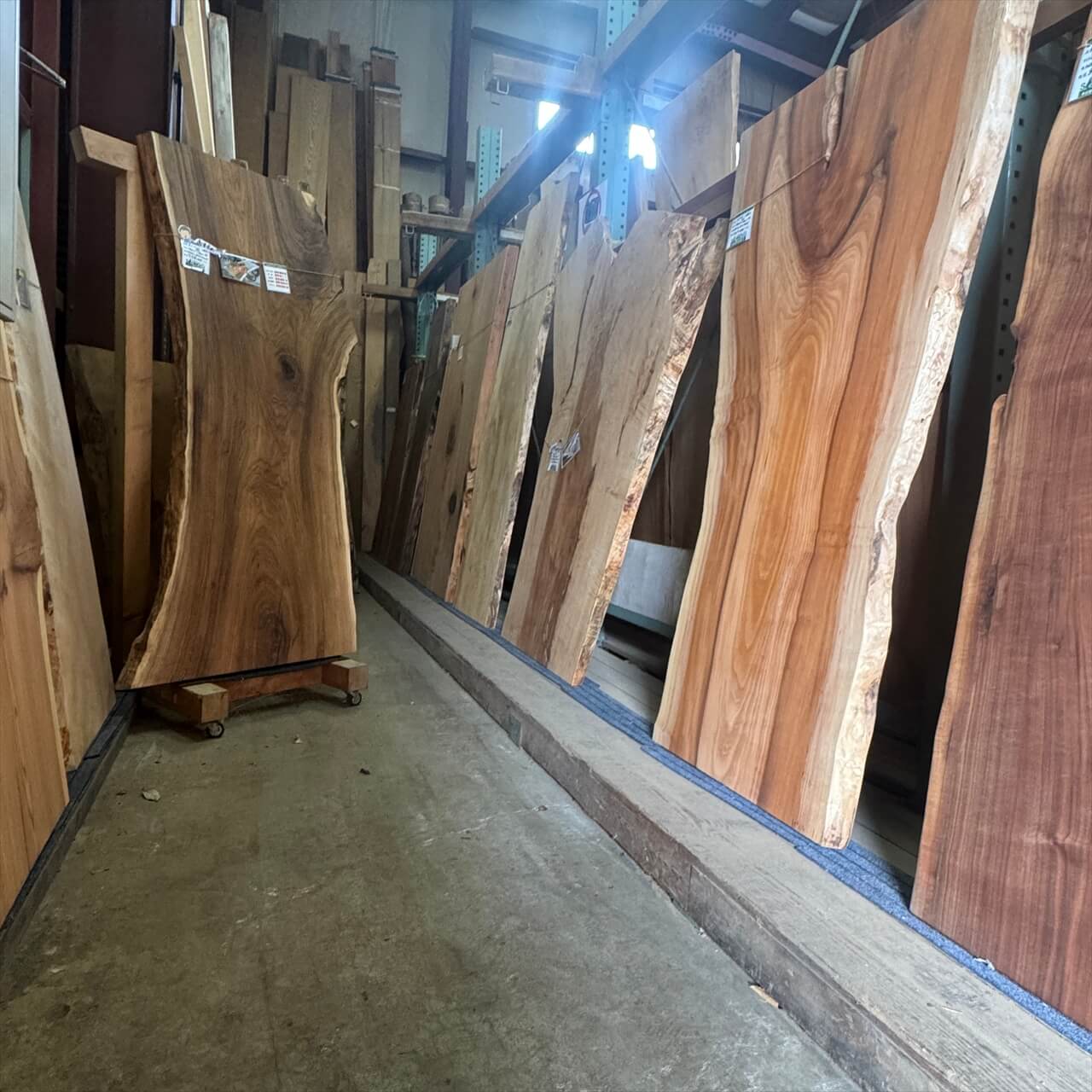 展示倉庫には、店主がみずから選び抜いた「グッとくる」数百枚の一枚板を常時展示・販売しております。