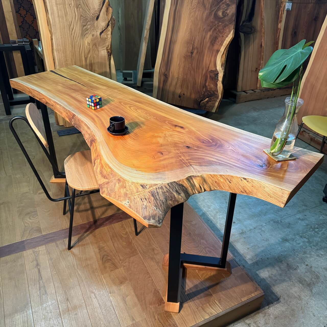 このけやきを「脚地」に据えてみると、下のようになります。アイアン脚と無垢材の平板を組み合わせた当店オリジナルのこの脚、接地面が広いのでぐらつきにくい、安定感があって良い、と大変好評です。