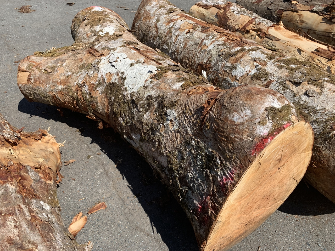 製材から数年間、倉庫で自然乾燥しながら保管していました。乾燥期間の数年で元口がザックリ割れてしまい、長さをカットしようか悩みましたが、一旦大きく割れてからは動きが落ち着いた感じだったので、今回はこの大きな割れを杉皮を使ったパテ補修で埋めることにしました。