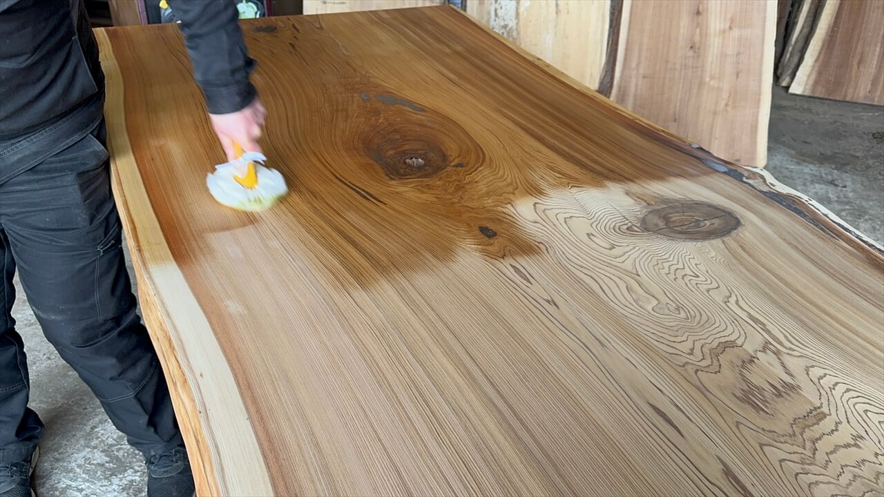 ここから一枚板の最終工程の「オイル塗装」になります。今見ているこの一枚板がオイルを塗ることでどんな変貌を遂げるのかワクワクする作業です。