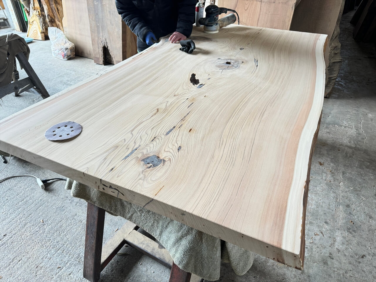 仕入れたときは、製材後間もなかったので水分を多く含んだその一枚板はとても重く、ひとりで持ち上げることも難しいほどでした。