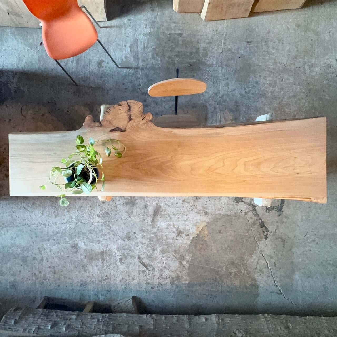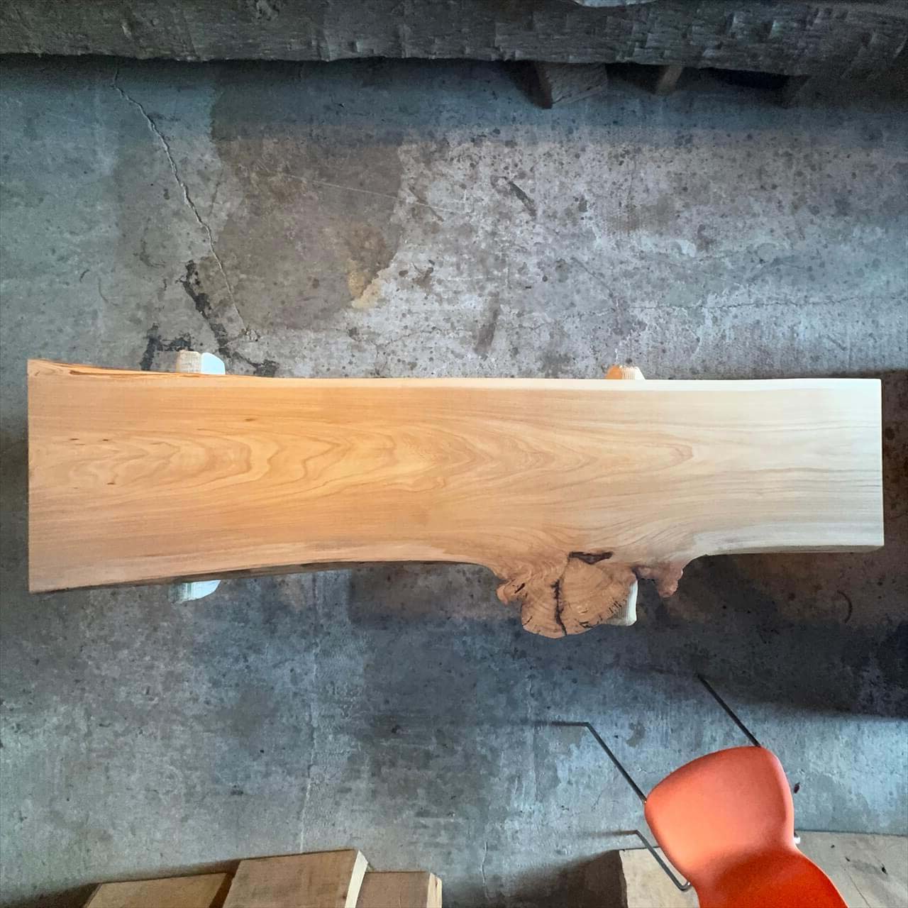 シリーズ「店主が推す本日の一枚板」、今日はこちらの飛び出たコブがチャームポイントのニレ一枚をあらためてご紹介いたします。この板と私との出会いから、仕上げの時に感じたこと、どのような用途に向いていそうかといったことまで、たっぷり語っていきたいと思います。