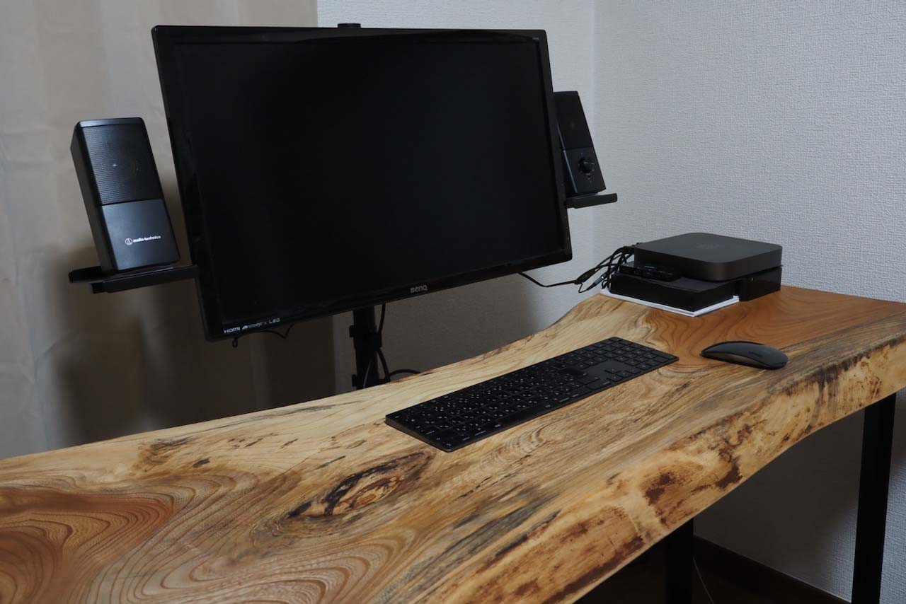 この記事でご紹介しているニレの場合は片側がほぼストレートカットに近い角度で、厚みも47mmありますのでモニタークランプは問題なく取り付けられると思いますが、上の写真のようにモニターを板の外に立ててしまうのも、こうした幅が狭めなカウンターサイズの板では良いアイデアではないかと思います。