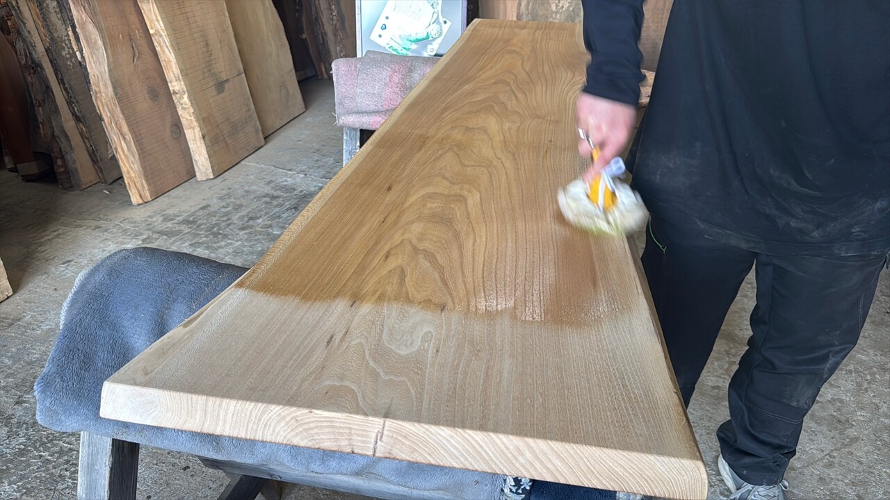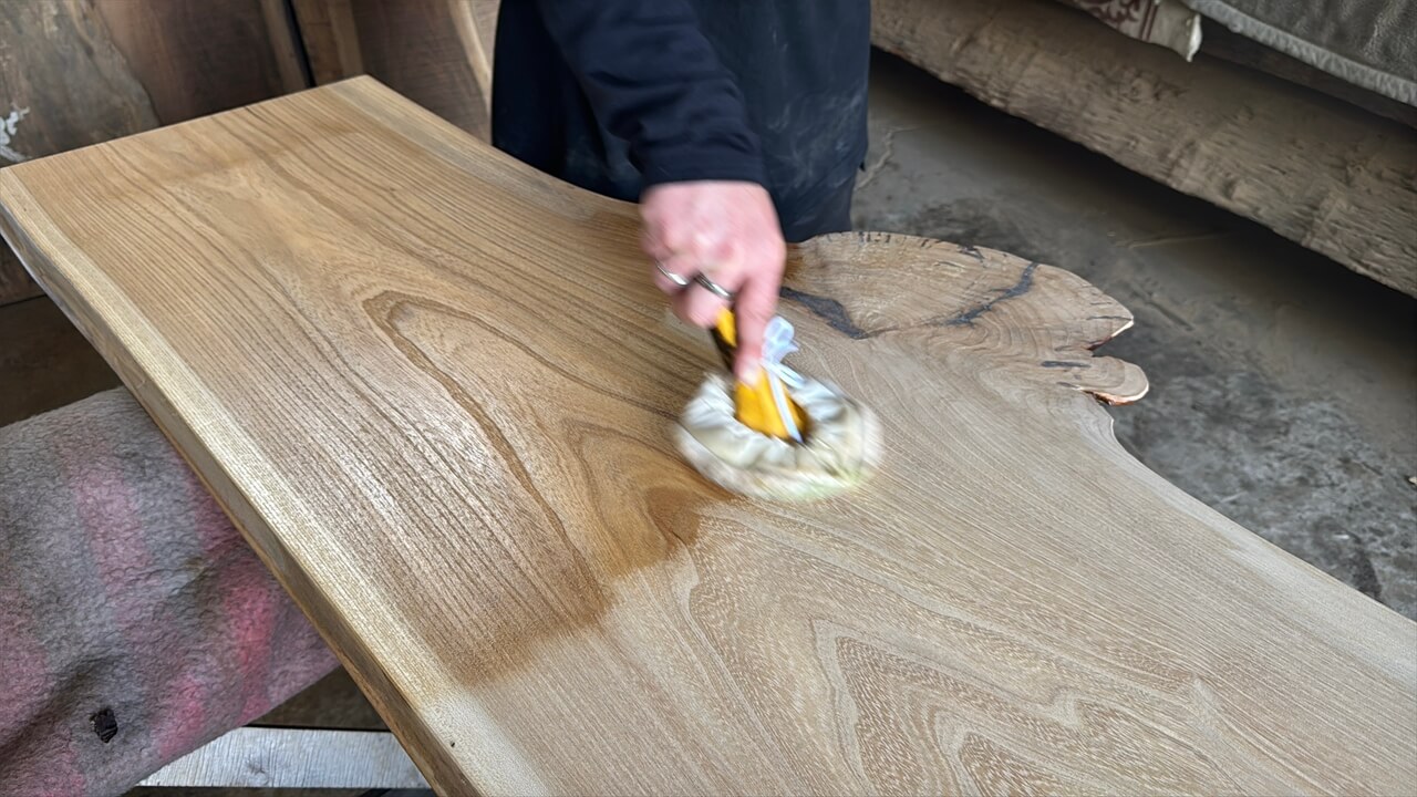 乾燥で反った一枚板を平らに削って、両面をサンディングで磨き上げ、耳の仕上げ、割れや朽ちたところの補修などが終わり、ここからお楽しみのオイル塗装に入ります。