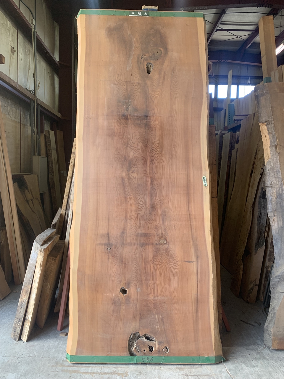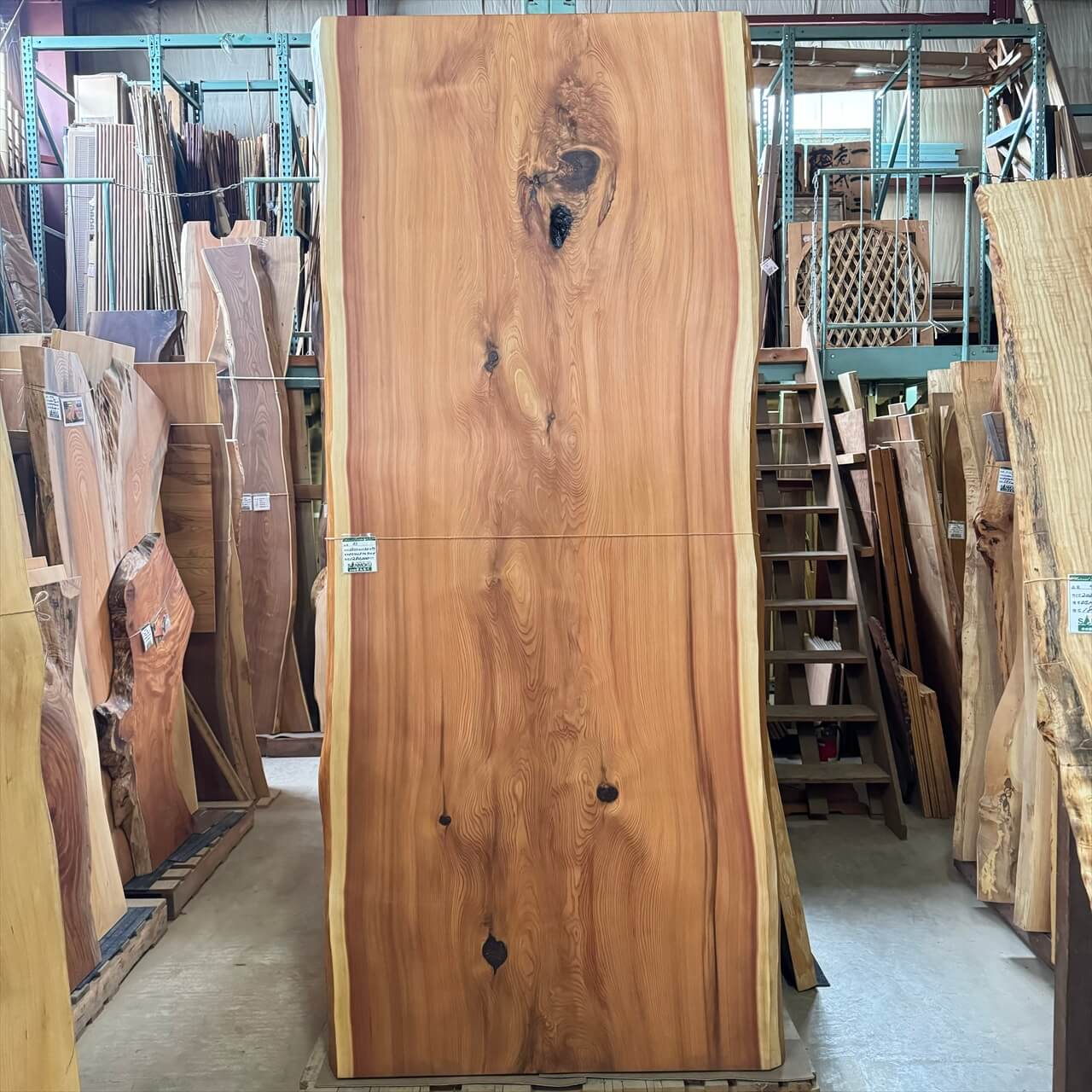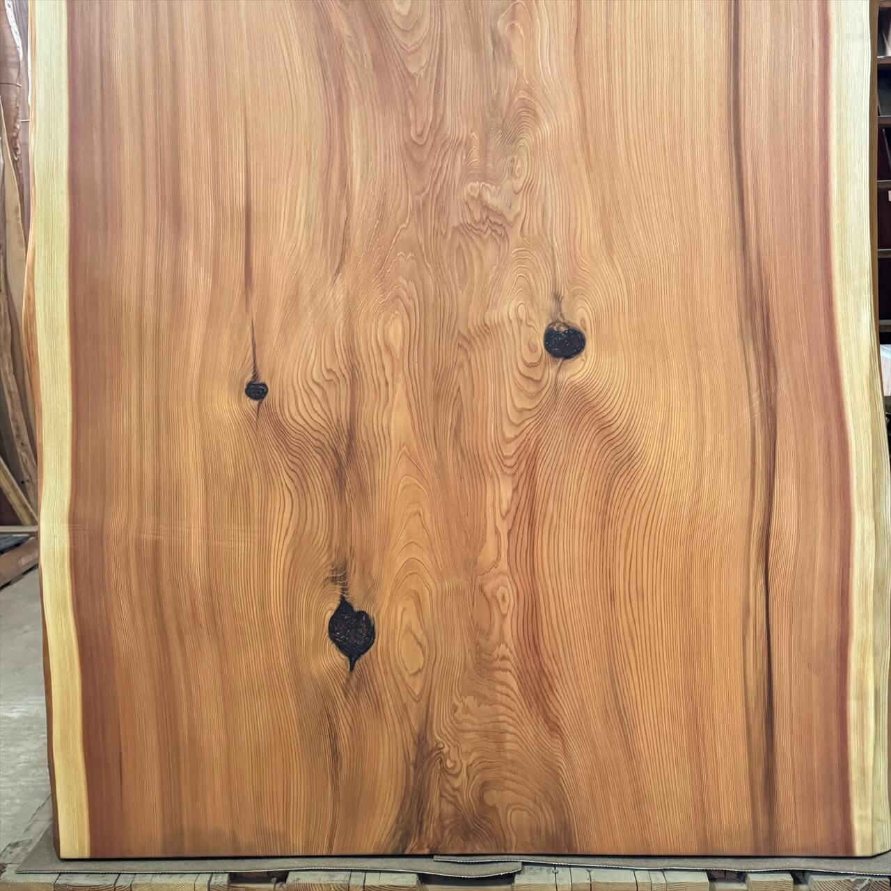 こちらは入荷後数年が経過したときに撮影した杉一枚板です。もちろん重量はあるのですが、入荷直後に比べると乾燥によってだいぶ乾き、大人二人で運んだり、立てかけたりすることがそれほど苦にはならない感じになりました。