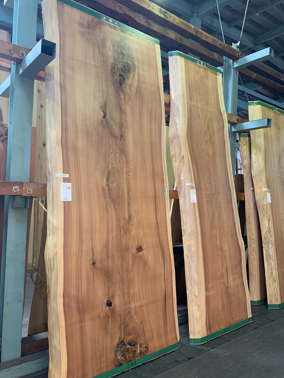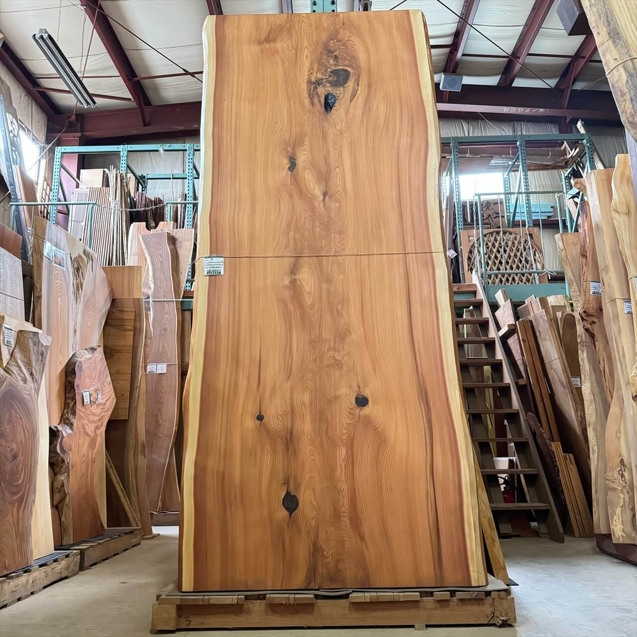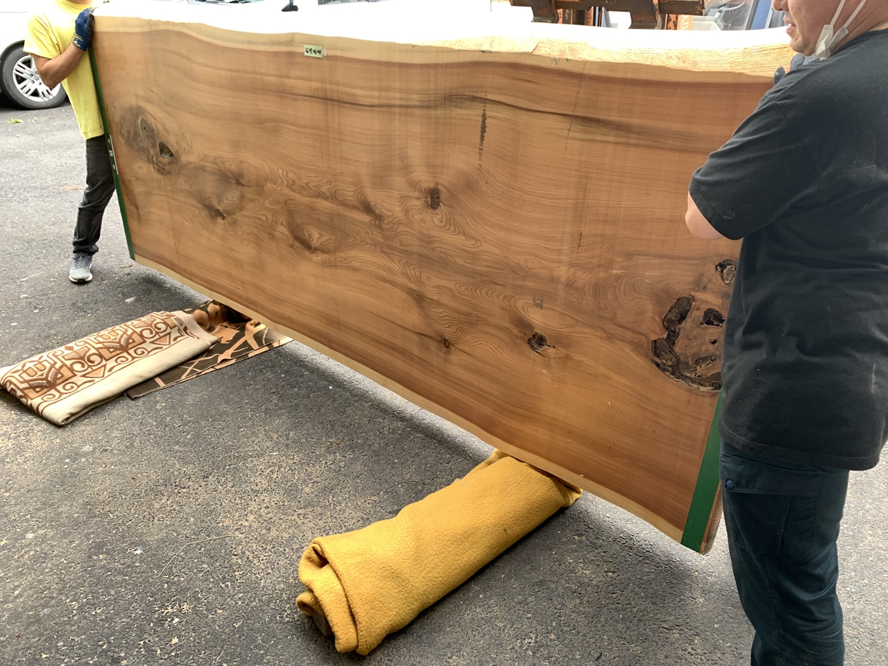 こちらは入荷後数年が経過したときに撮影した杉一枚板です。もちろん重量はあるのですが、入荷直後に比べると乾燥によってだいぶ乾き、大人二人で運んだり、立てかけたりすることがそれほど苦にはならない感じになりました。