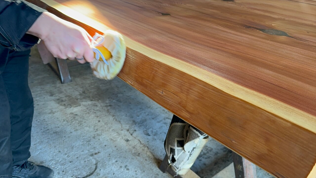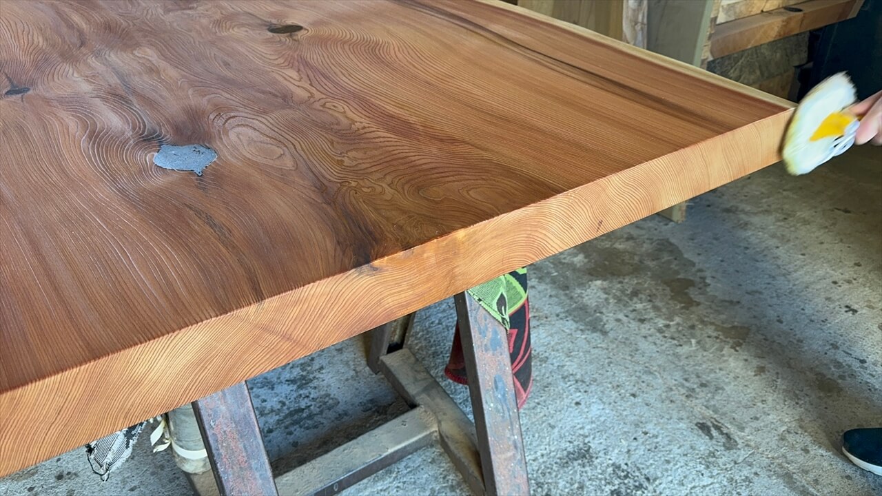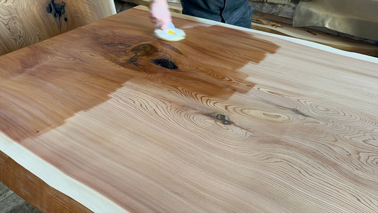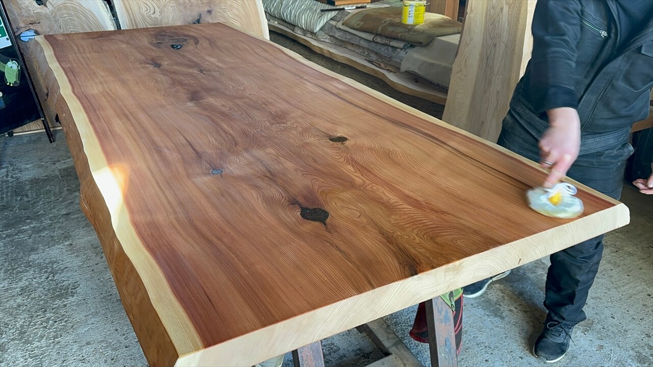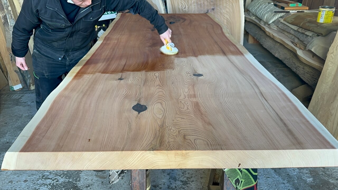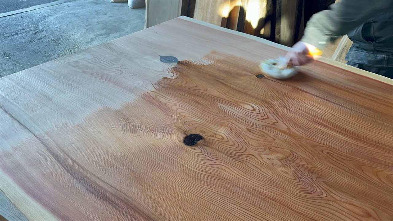 オイル塗装の様子と、この杉一枚板を私が解説している動画になります。ぜひご覧ください。↓