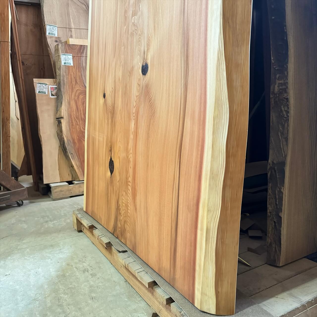 こちらは入荷後数年が経過したときに撮影した杉一枚板です。もちろん重量はあるのですが、入荷直後に比べると乾燥によってだいぶ乾き、大人二人で運んだり、立てかけたりすることがそれほど苦にはならない感じになりました。