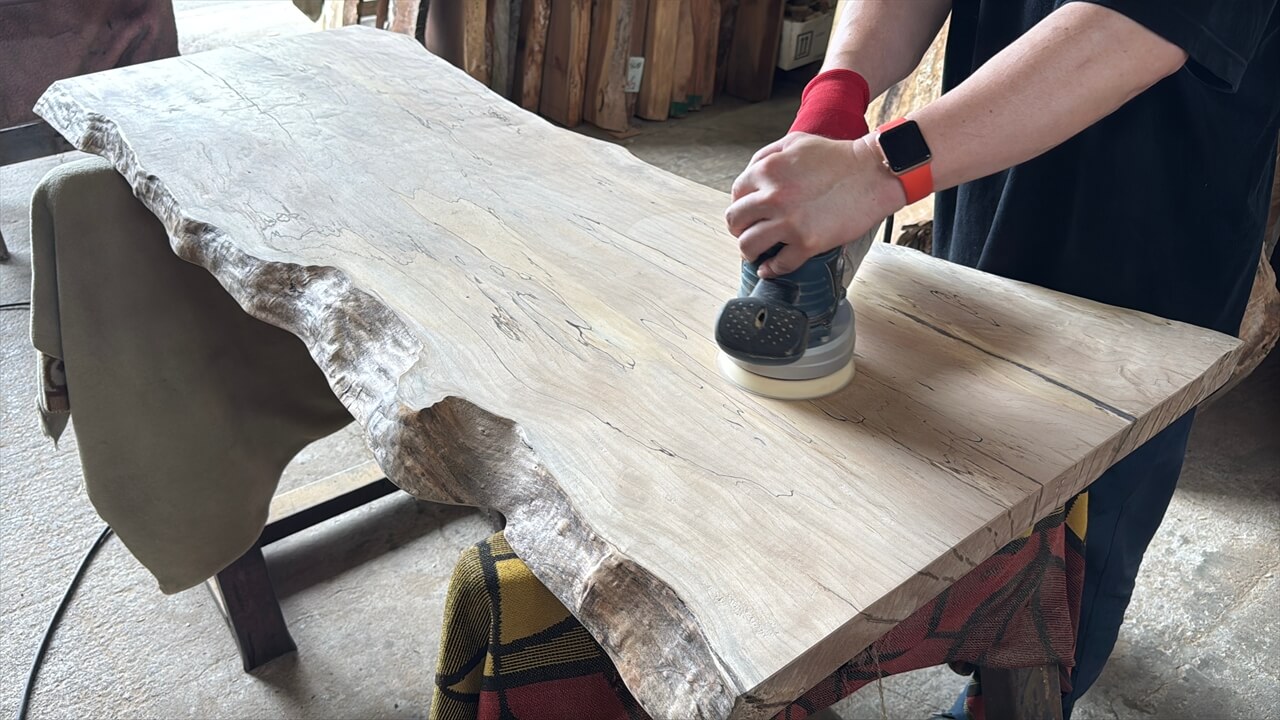 岩手県産のイタヤカエデの原木から製材した一枚板を数年間の自然乾燥をしたのち、オイルで仕上げをしていきます。