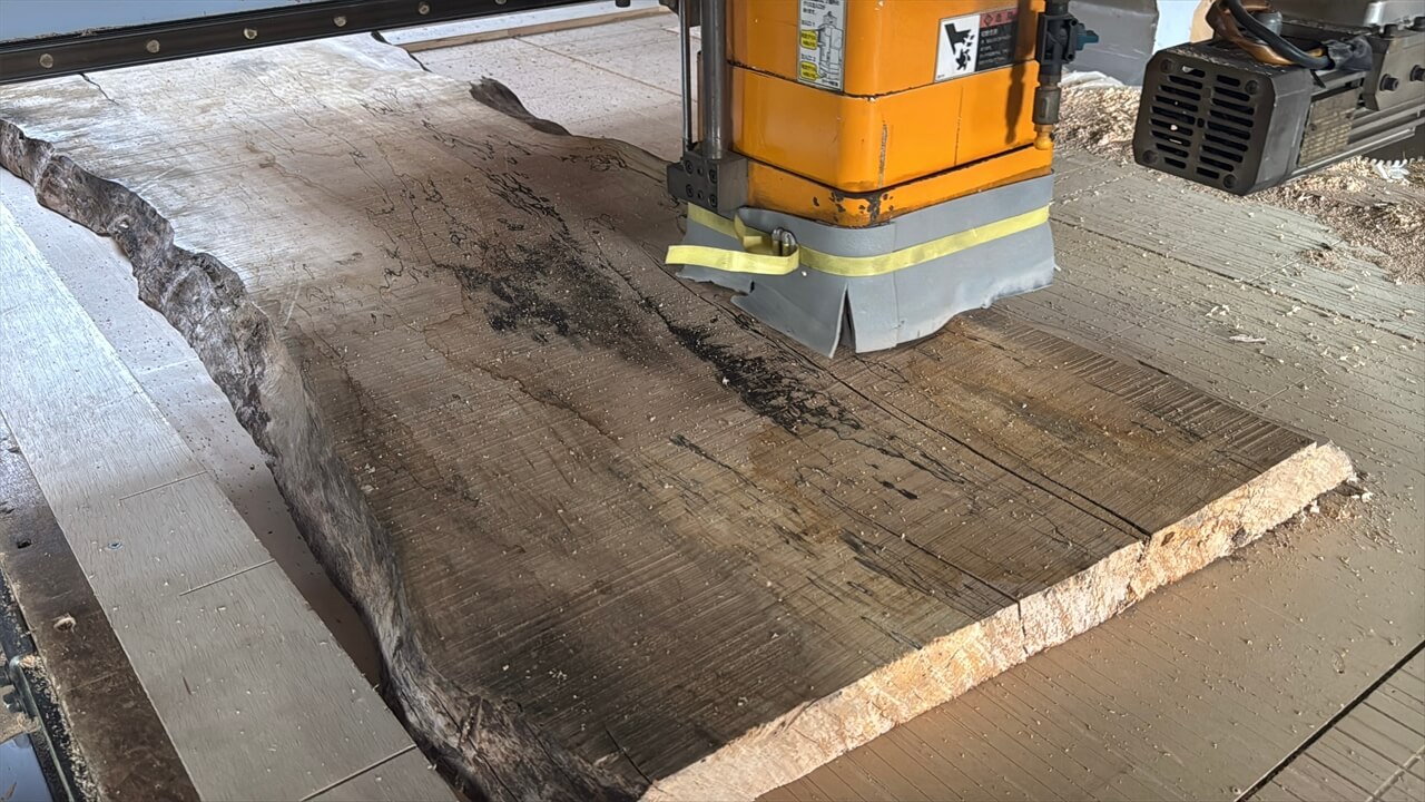 まずは製材された状態で、数年の乾燥による一枚板の反りを平らにすべく、両面を平らに削っていきます。