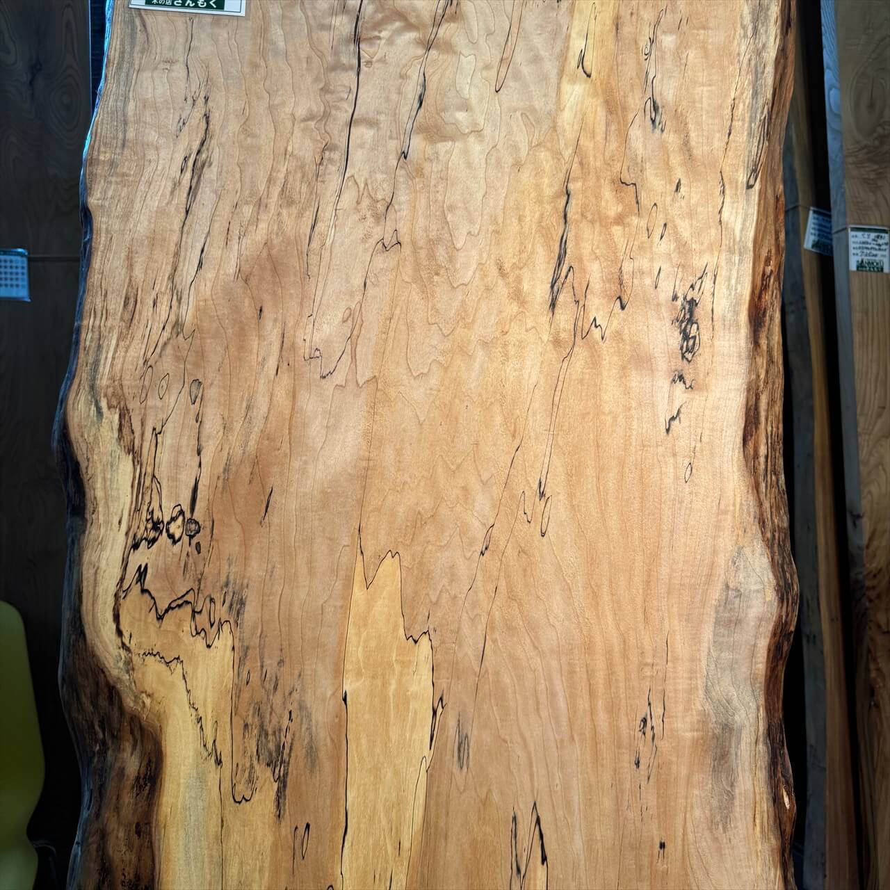 全体像だけでなく、クローズアップの写真もこの板の商品ページにたくさんありますから、是非じっくりご覧いただけると幸いです。腐朽菌が描くスポルテッド模様とブルーステイン(青シミ)が織りなす風景はまさに「自然によるアート」そのもの。時が経つのを忘れて、いつまでも眺めていたくなると思います。