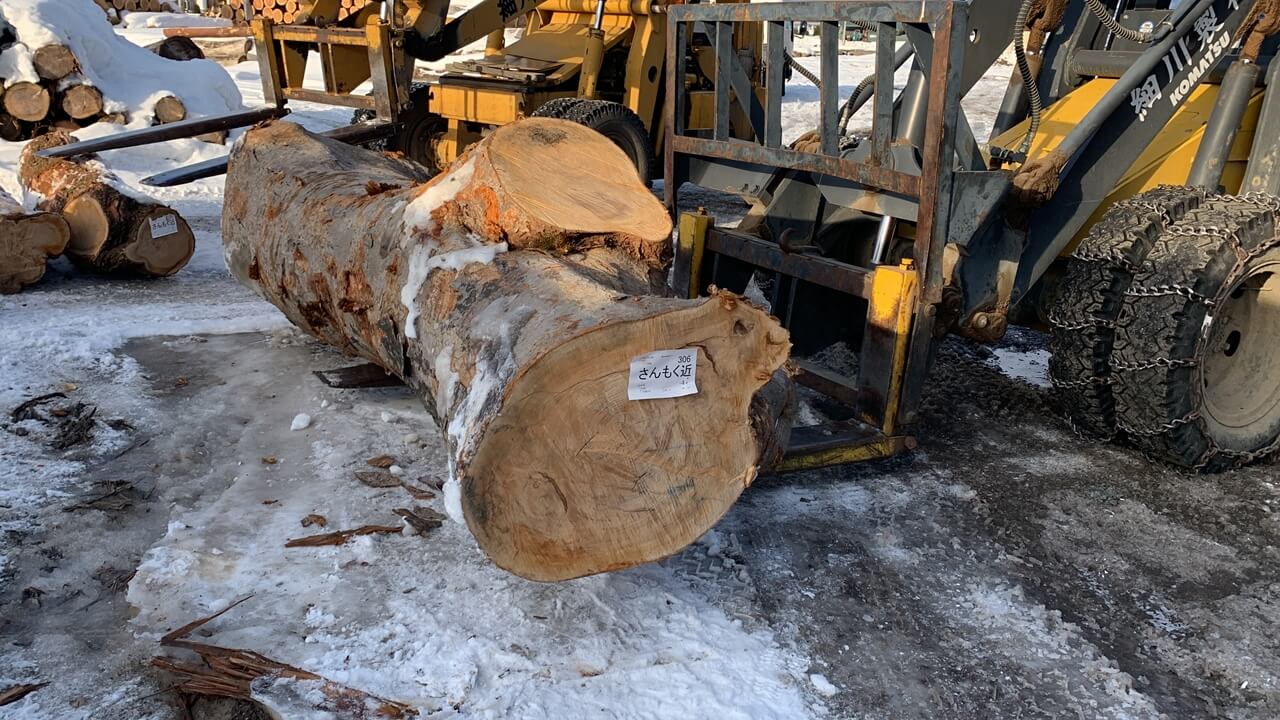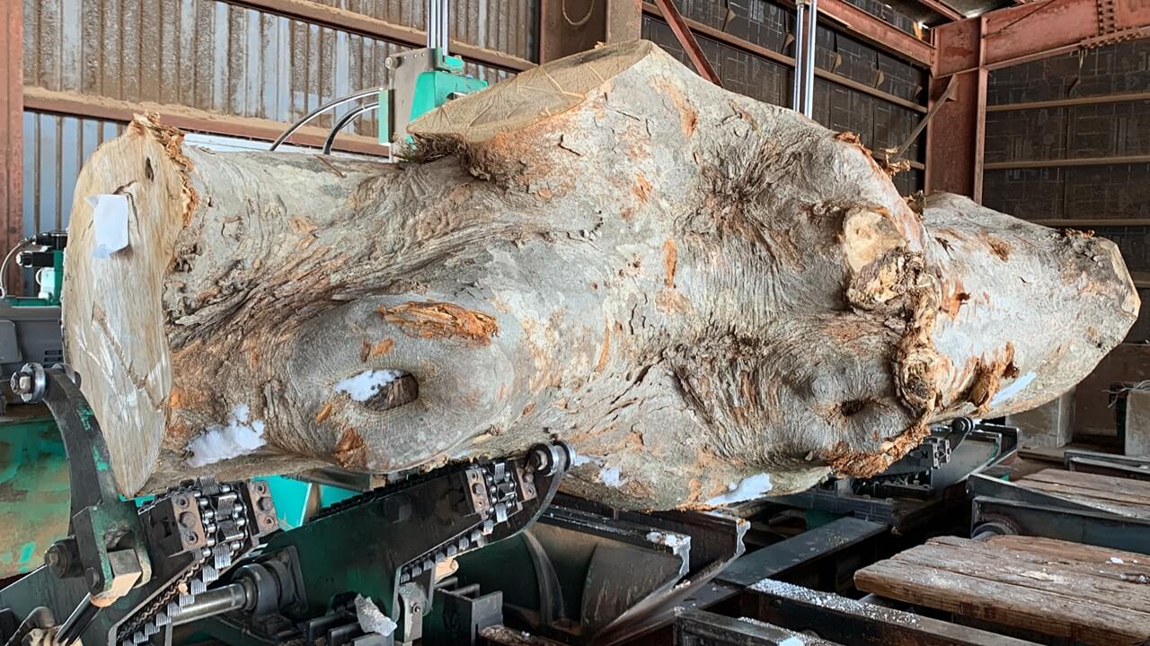 枝が大きく飛び出し、形もまっすぐ素直とは言えません。こういう原木は、どう製材するかによって、板の表情が大きく変わります。