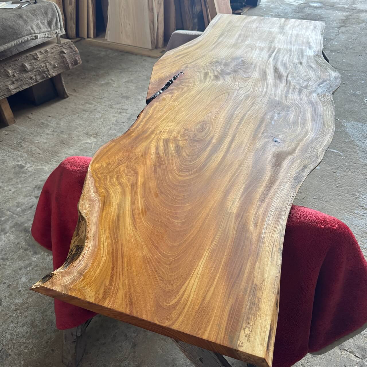 ゴツゴツなケヤキ原木から製材された一枚板