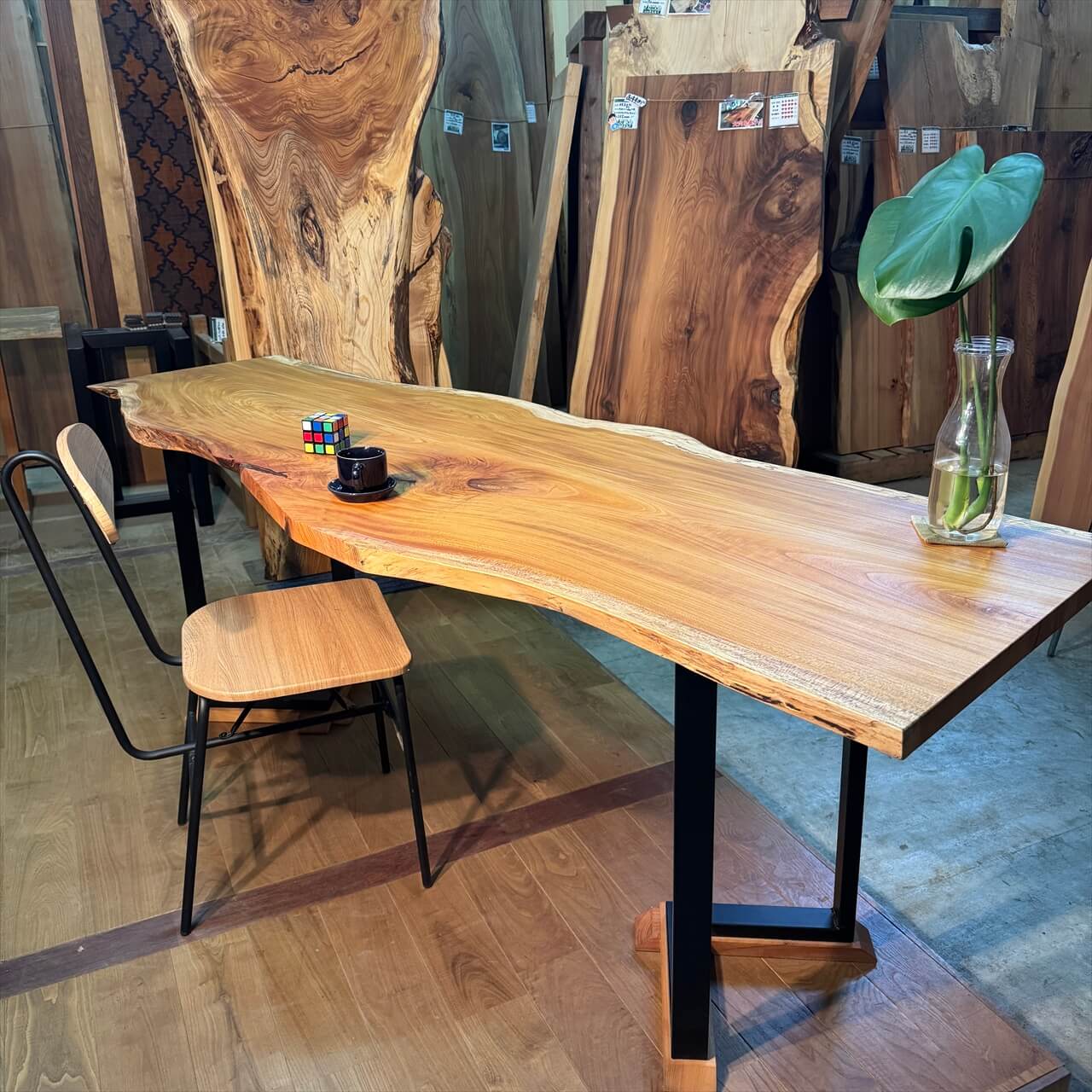 下は木の店さんもくオリジナルのテーブル脚「脚地」とこのけやき板を組み合わせた姿です。「脚地」はアイアン脚に無垢材から削り出した平板を組み合わせた商品で、板をボルトオンせずに「載せるだけ」で使った場合でも、アイアンだけの脚に比べて安定感がある、とお客様からは大変ご好評をいただいている人気商品です(※ボルトオン加工して納品することもできます)。