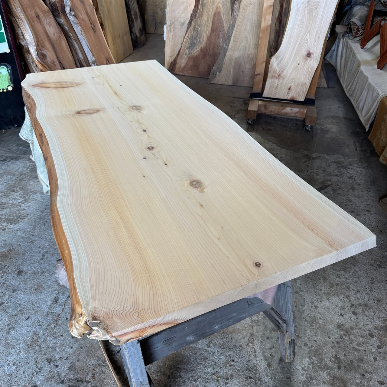 こちらは一枚板として仕上げる作業を終えて、オイル塗装する直前のサワラ一枚板です。↓