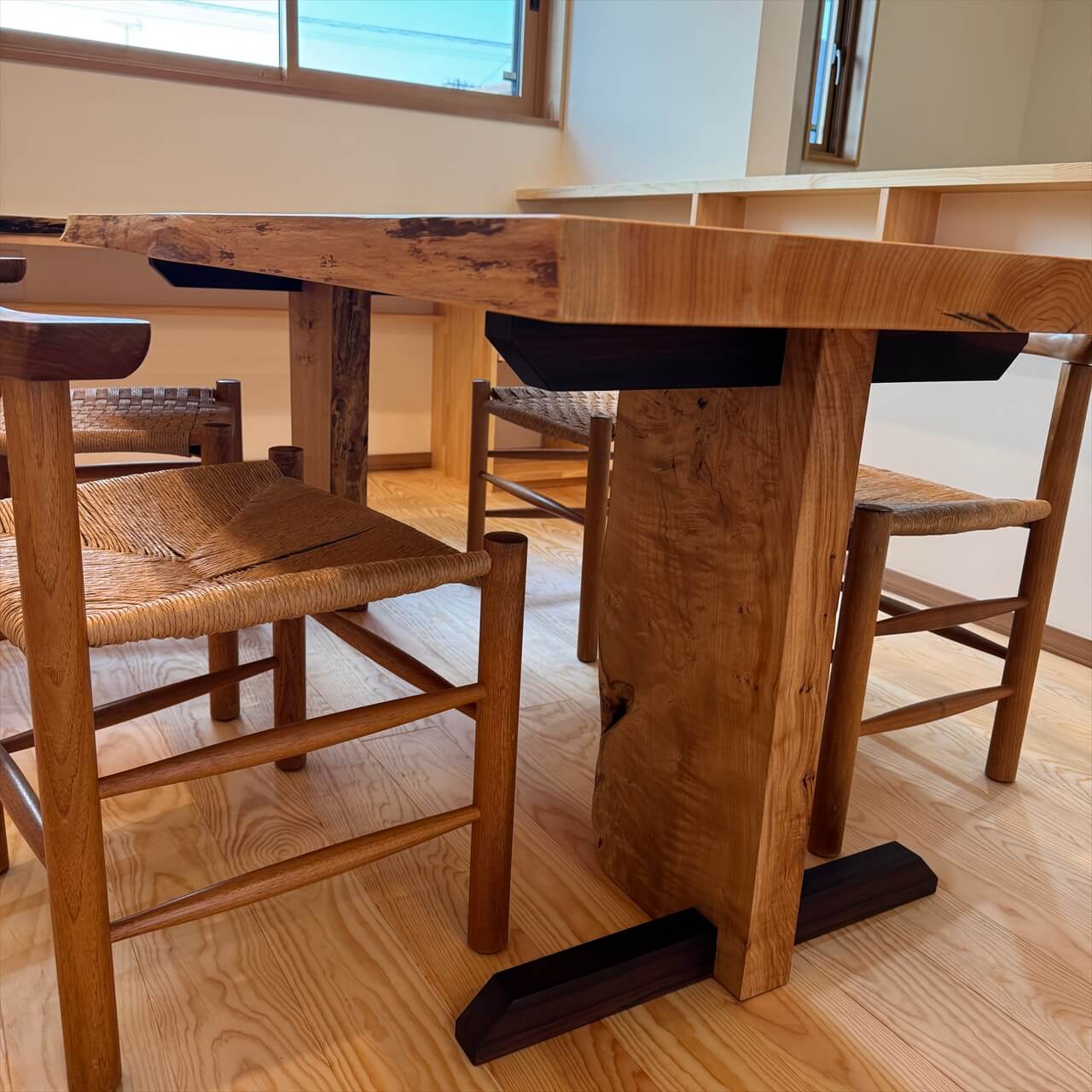 今回は、お客様が気に入られた一枚板に、さんもくオリジナル脚を組み合わせたセットをご採用いただきました。