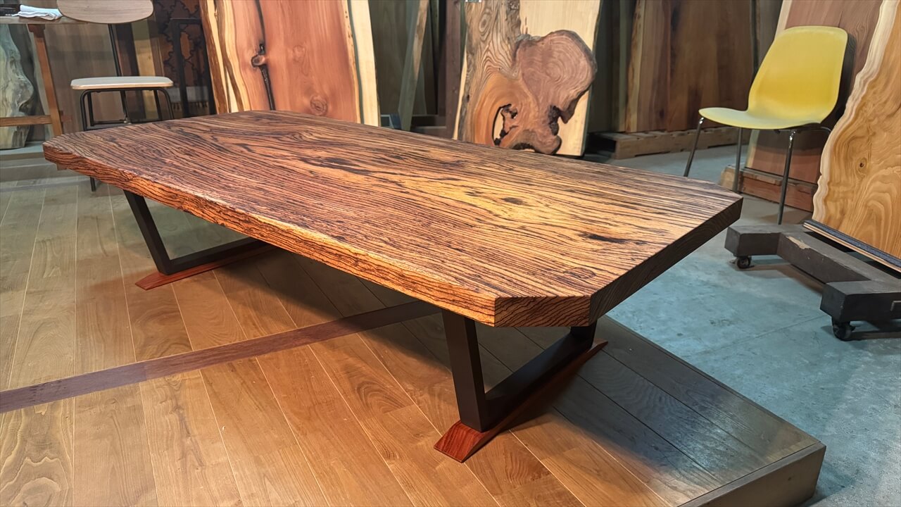 今から5~60年ほど前に日本の高度経済成長とともに住宅着工ラッシュで東南アジアのコクタン、シタン、カリンとともに、たくさん使われた材になります。現在とは違い、日本住宅には床の間が設けられた座敷に置かれる座卓がとても流行った時代です。当時は東南アジア材とともにアフリカのブビンガ材が主流で、このゼブラウッドも同じように座卓や和風建築の銘木として使われていました。