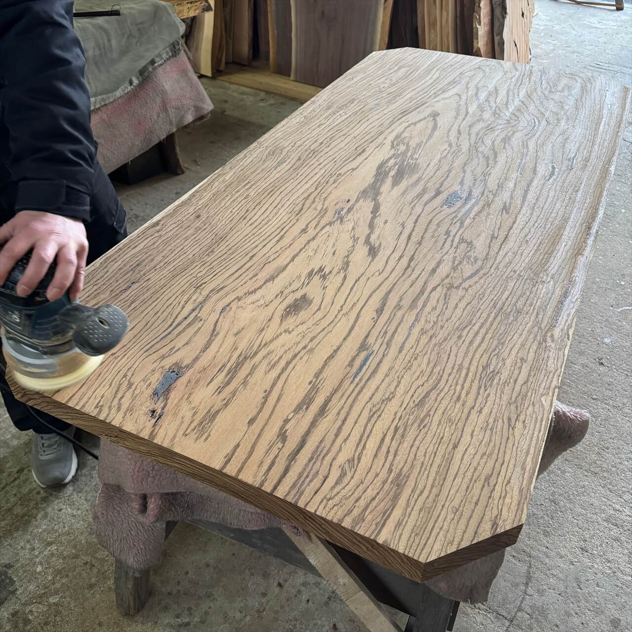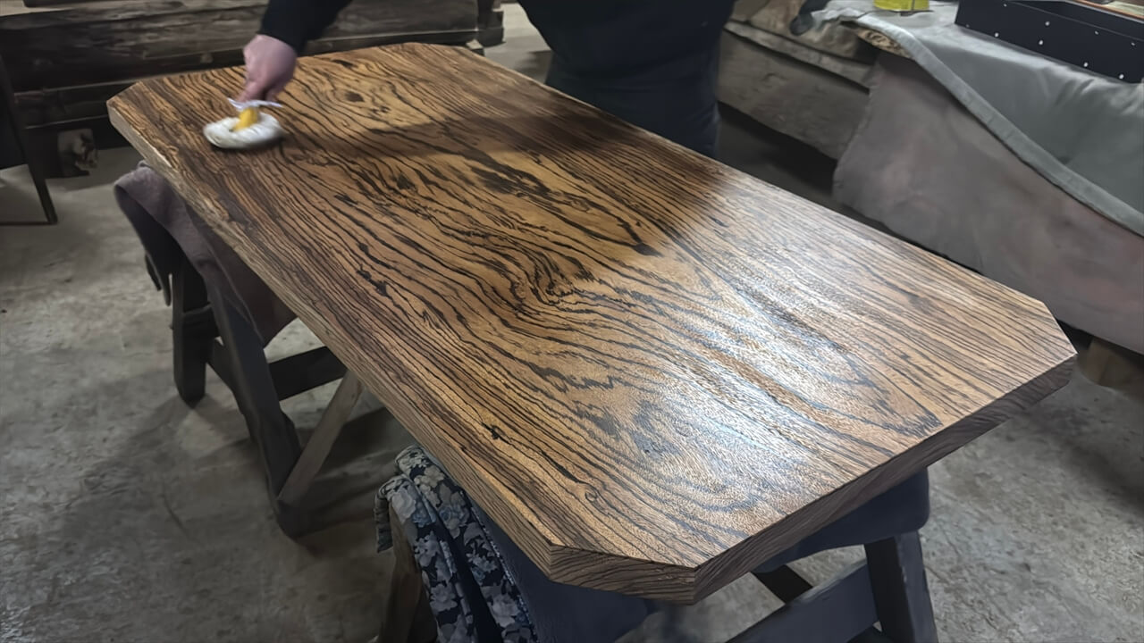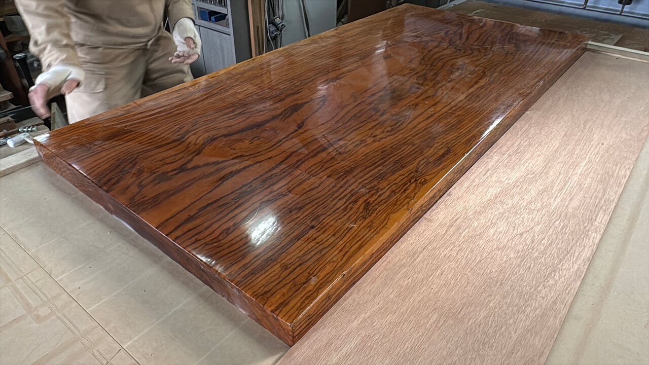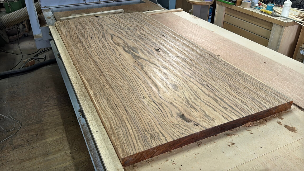塗装前ですが、ゼブラウッドの力強い木目がしっかりと出ています。ここからオイルでどんな表情になるのか、とても楽しみです。
