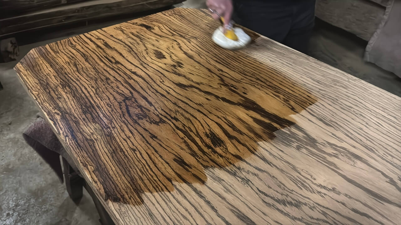 植物油のオイル塗装は膜を張って表面を覆うのではなく、オイルを木に染み込ませていく塗装になります。木の感じを楽しめる手触りになります。しっとりと落ち着いた質感になって、ゼブラウッドの表情がより引き立ちました。