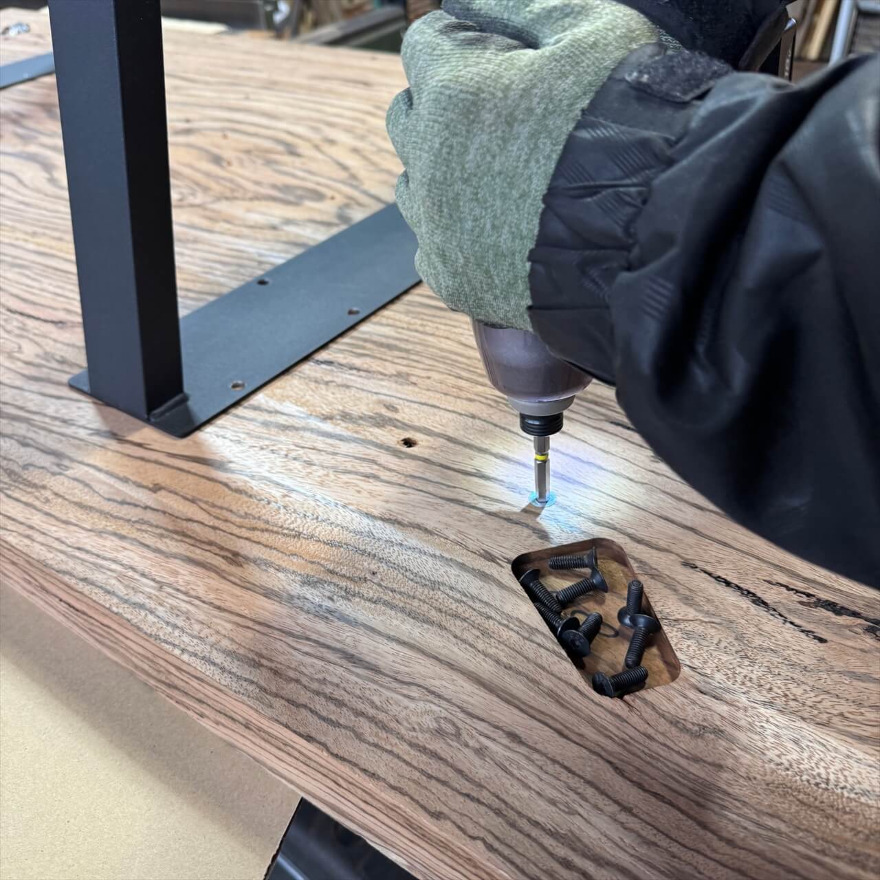 一枚板の裏側にメスネジを埋め込み、ボルトでアイアン脚を取り付けていきます。将来的には脚を外すこともでき、ローテーブルから、脚を替えることでイスを使ったダイニングテーブルとして使うこともできます。