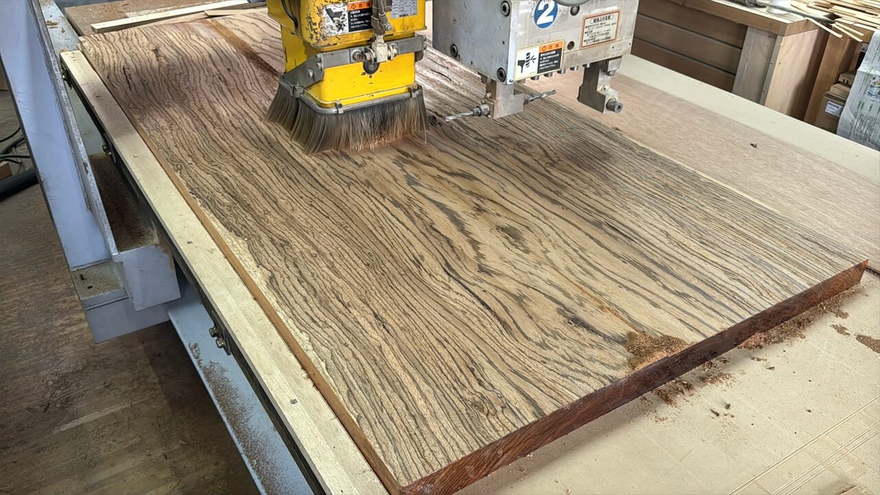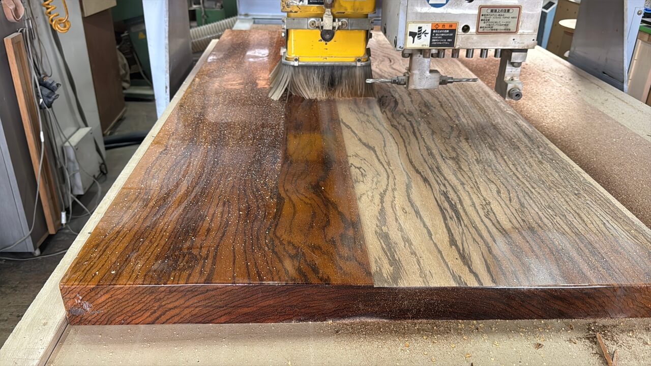 もともと付いていた四つ脚を外して、ゼブラウッド一枚板の両面をプレーナー加工で削っていきます。