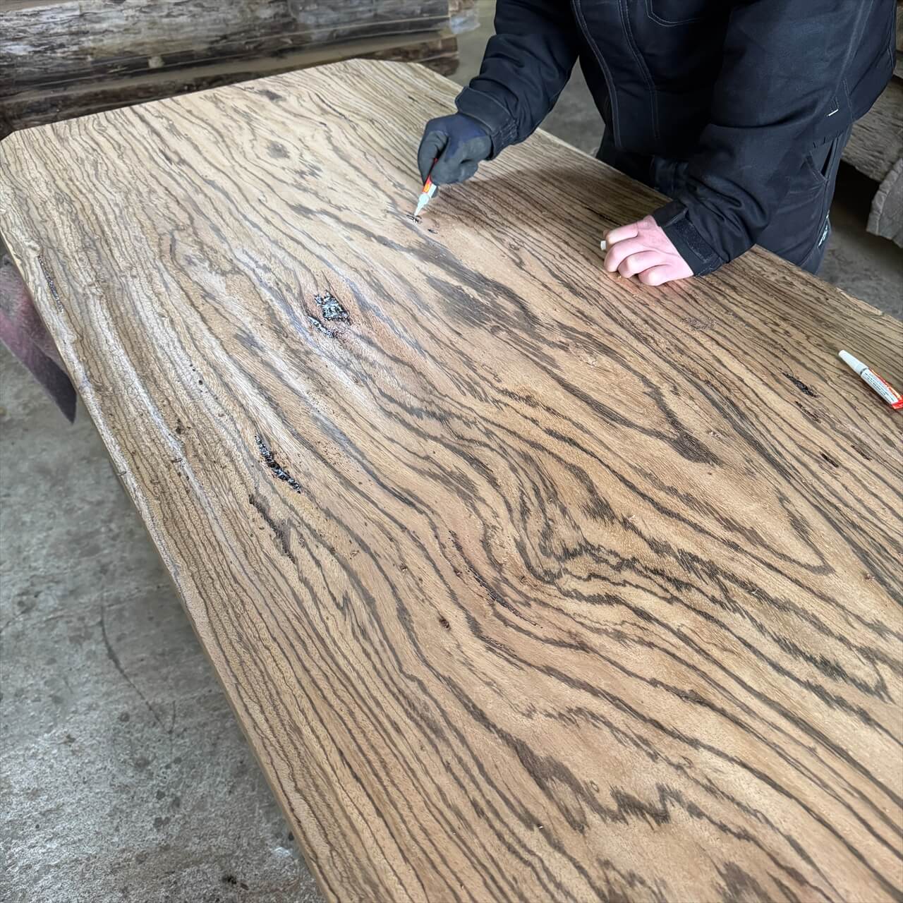 硬いウレタン塗装ではわからなかったのですが、一枚板を削ってみると、ところどころに朽ちたところがあったので補修していきます。↓