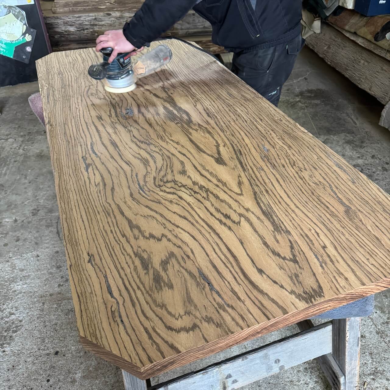 オイル塗装前のサンディング加工で一枚板を磨き上げていきます。
