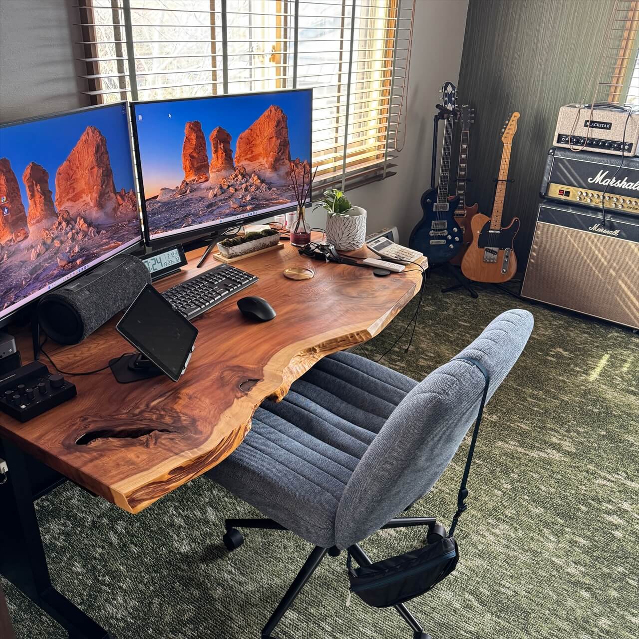 耳の形もまっすぐではなく、出入りがあり自然の形そのままな野性味あふれる天然木の一枚板にPCやモニターのデジタル機器の対比が新鮮で、しかも落ち着いた雰囲気もあり、ゆったりと心豊かなPCワーク空間となりました。