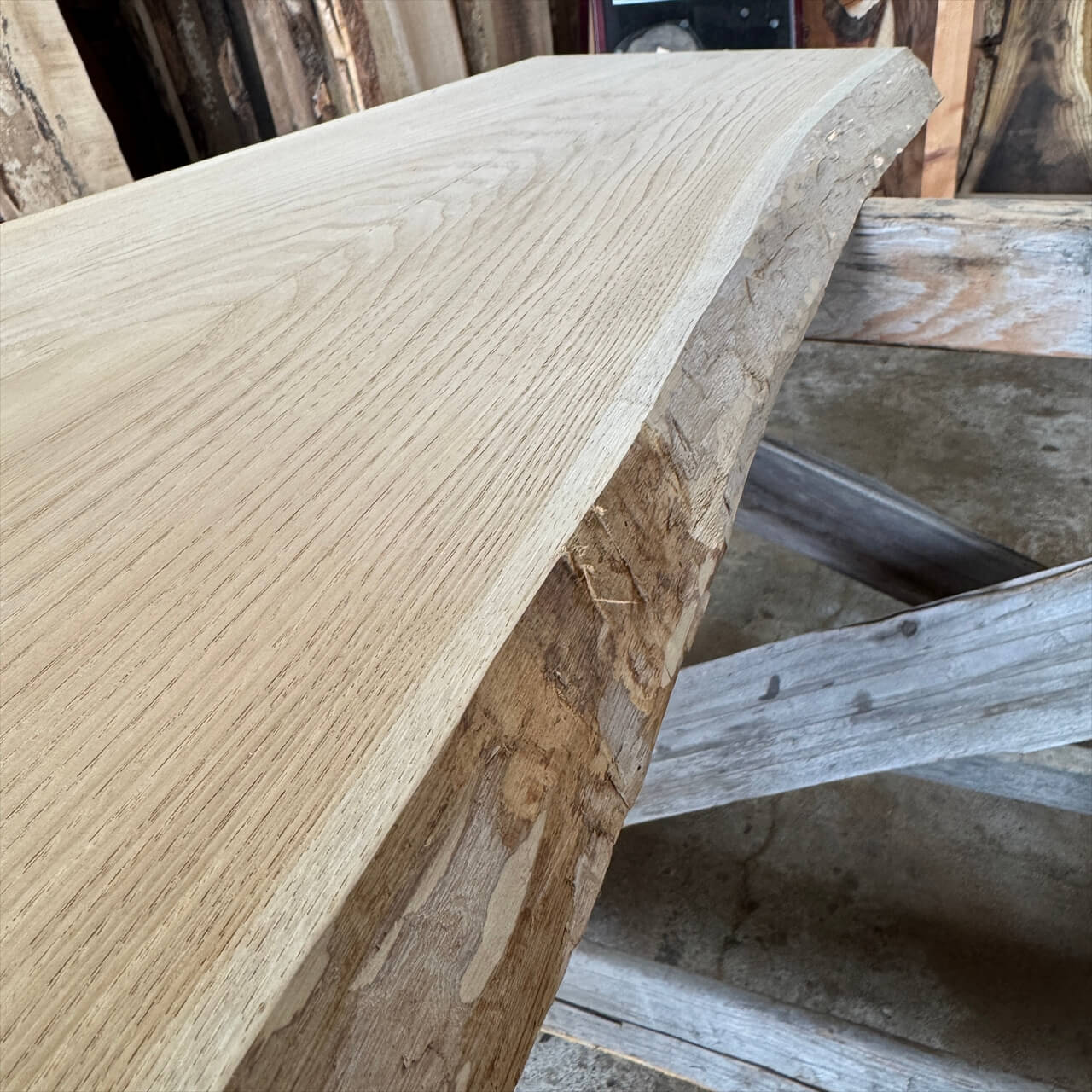 板に対して直角、90度の木口カットを目指していますが、両耳が付いている一枚板が多いためある程度の目測によるカットとなります。