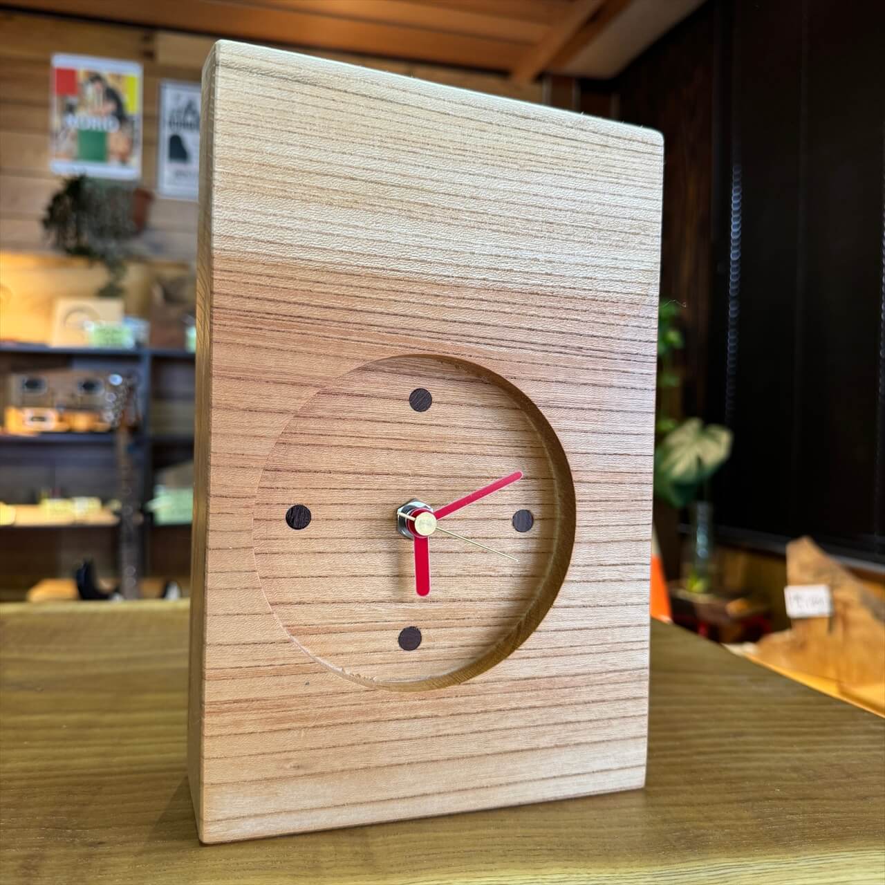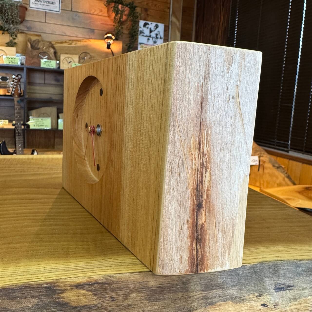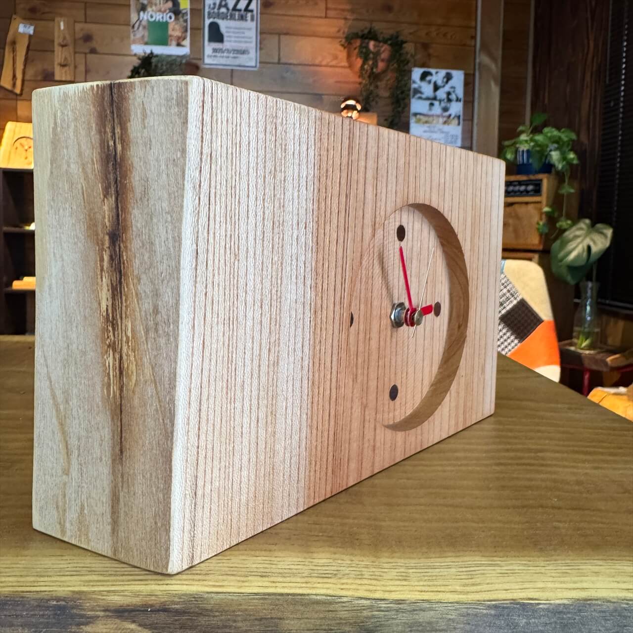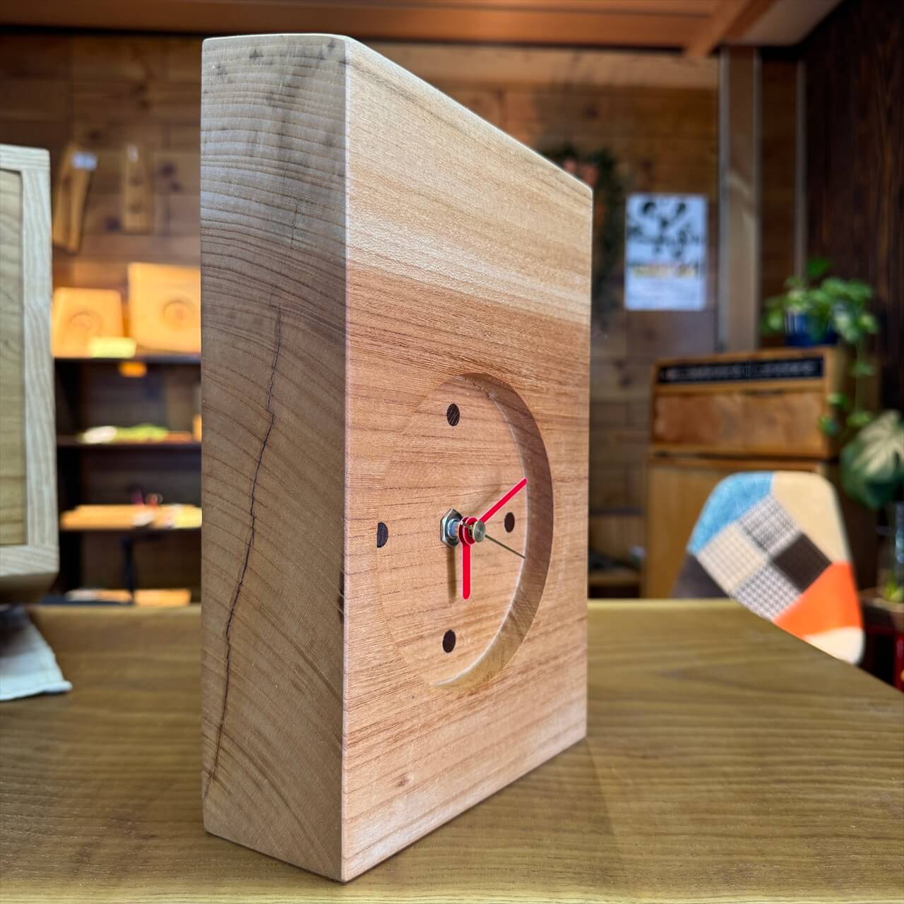 この時計は、製材や家具製作で切り落とされた小さな端材から生まれました。割れや虫穴など、木が歩んできた証をあえて残し、手を加えすぎず自然のままの風合いを大切にしています。デジタル全盛の時代に、アナログ時計が刻むわずかな“ずれ”もまた、暮らしの中の豊かな時間として楽しんでいただけます。