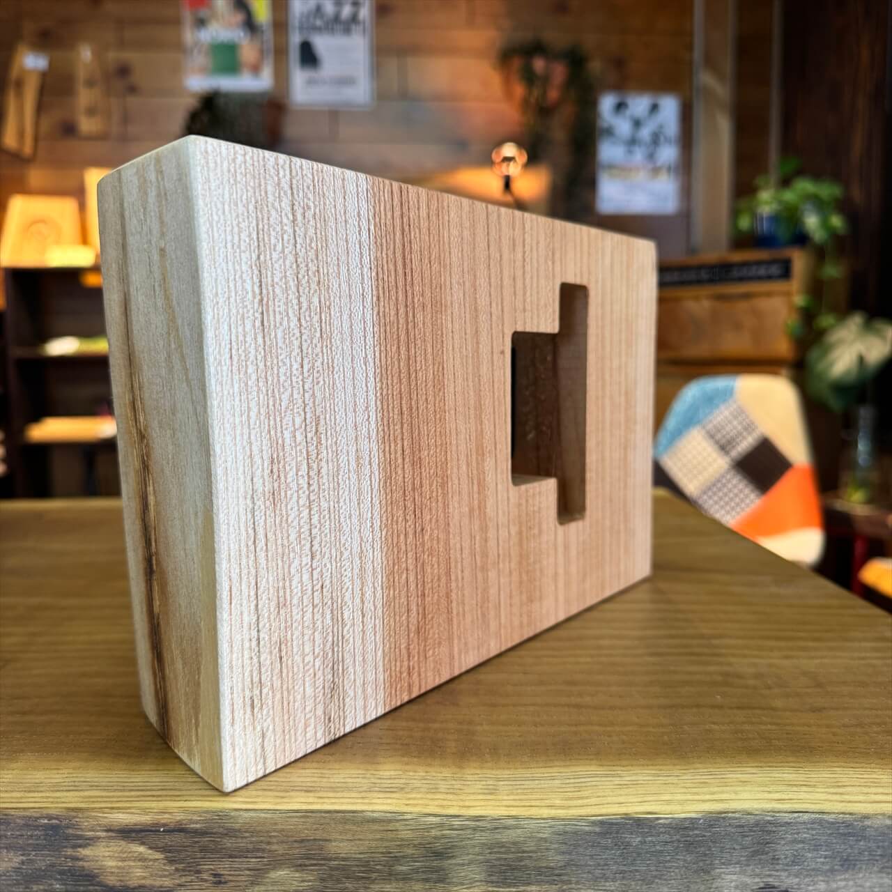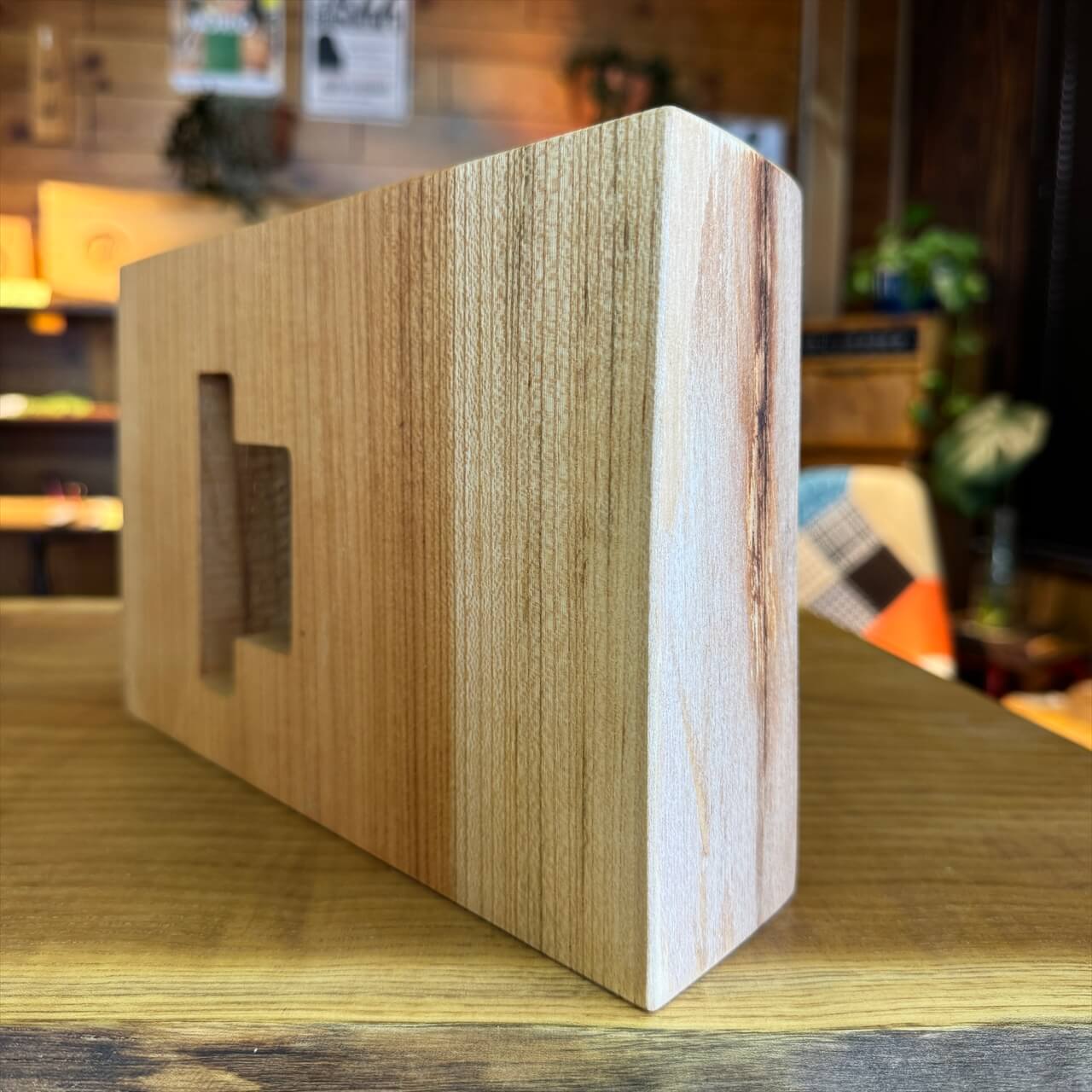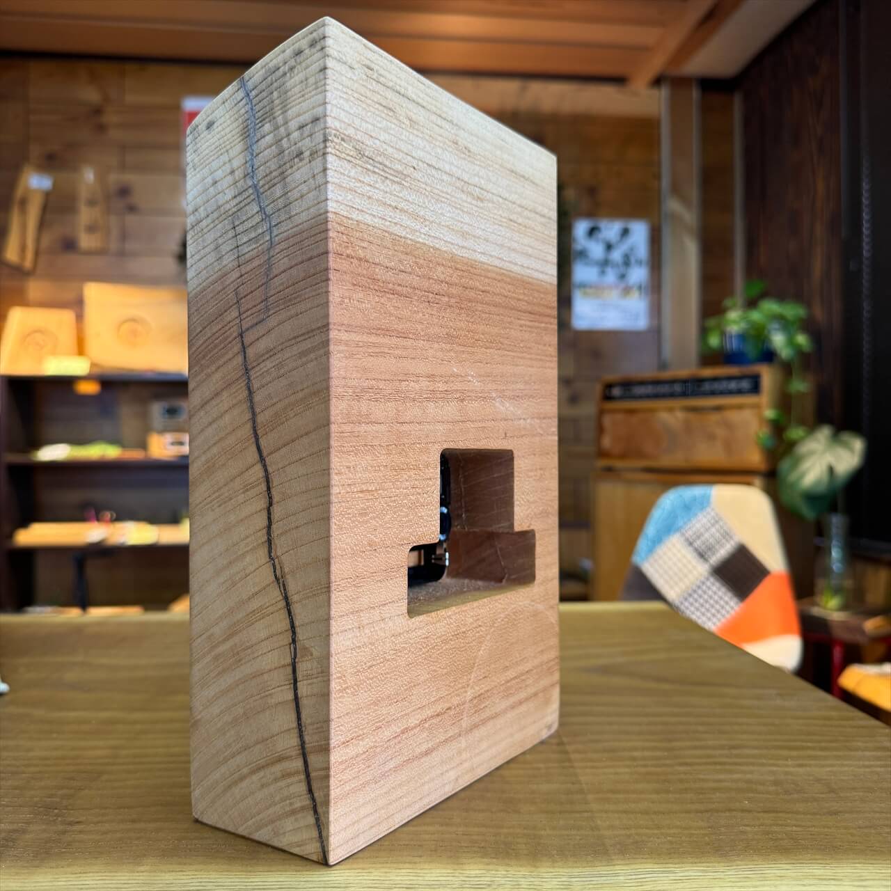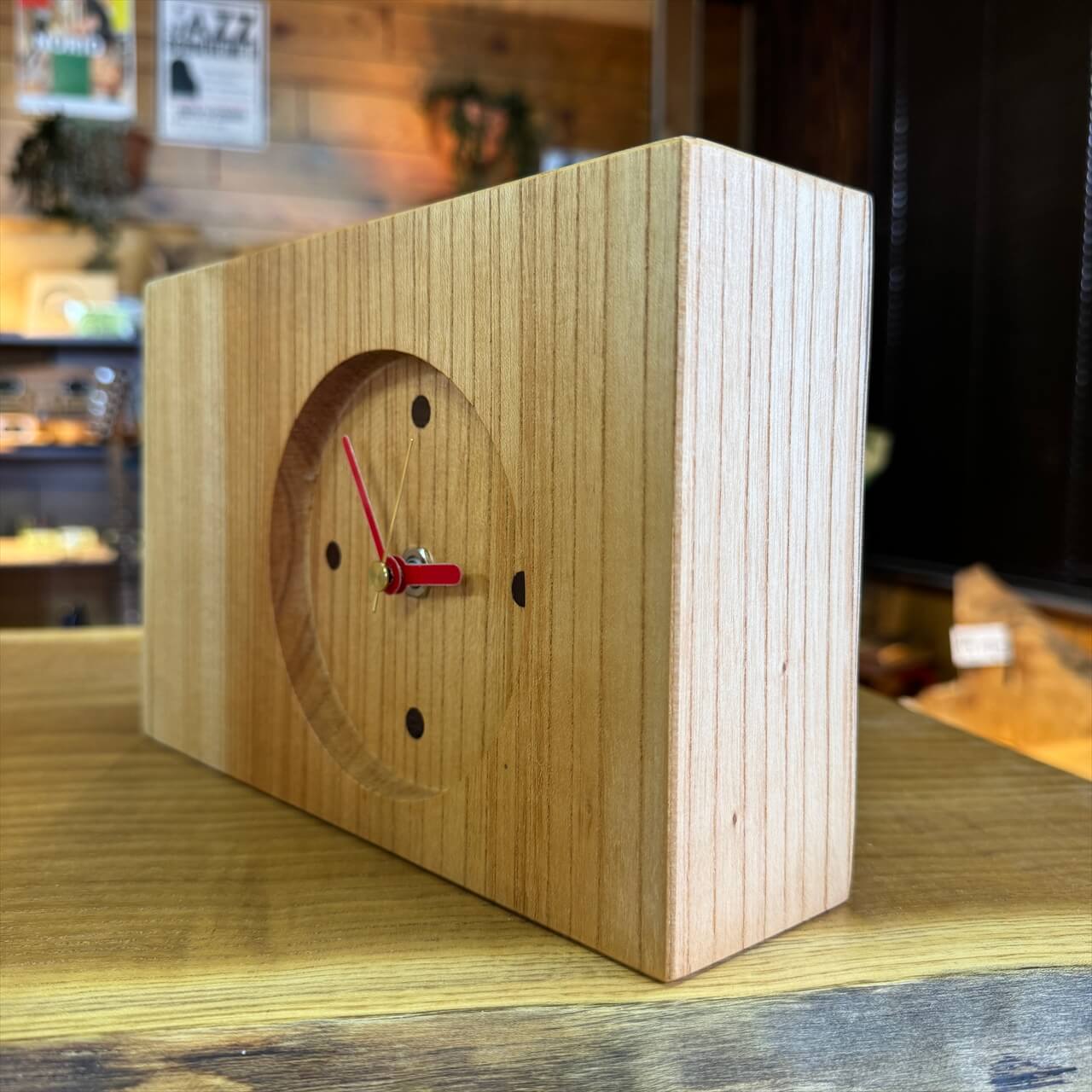 この時計は、製材や家具製作で切り落とされた小さな端材から生まれました。割れや虫穴など、木が歩んできた証をあえて残し、手を加えすぎず自然のままの風合いを大切にしています。デジタル全盛の時代に、アナログ時計が刻むわずかな“ずれ”もまた、暮らしの中の豊かな時間として楽しんでいただけます。