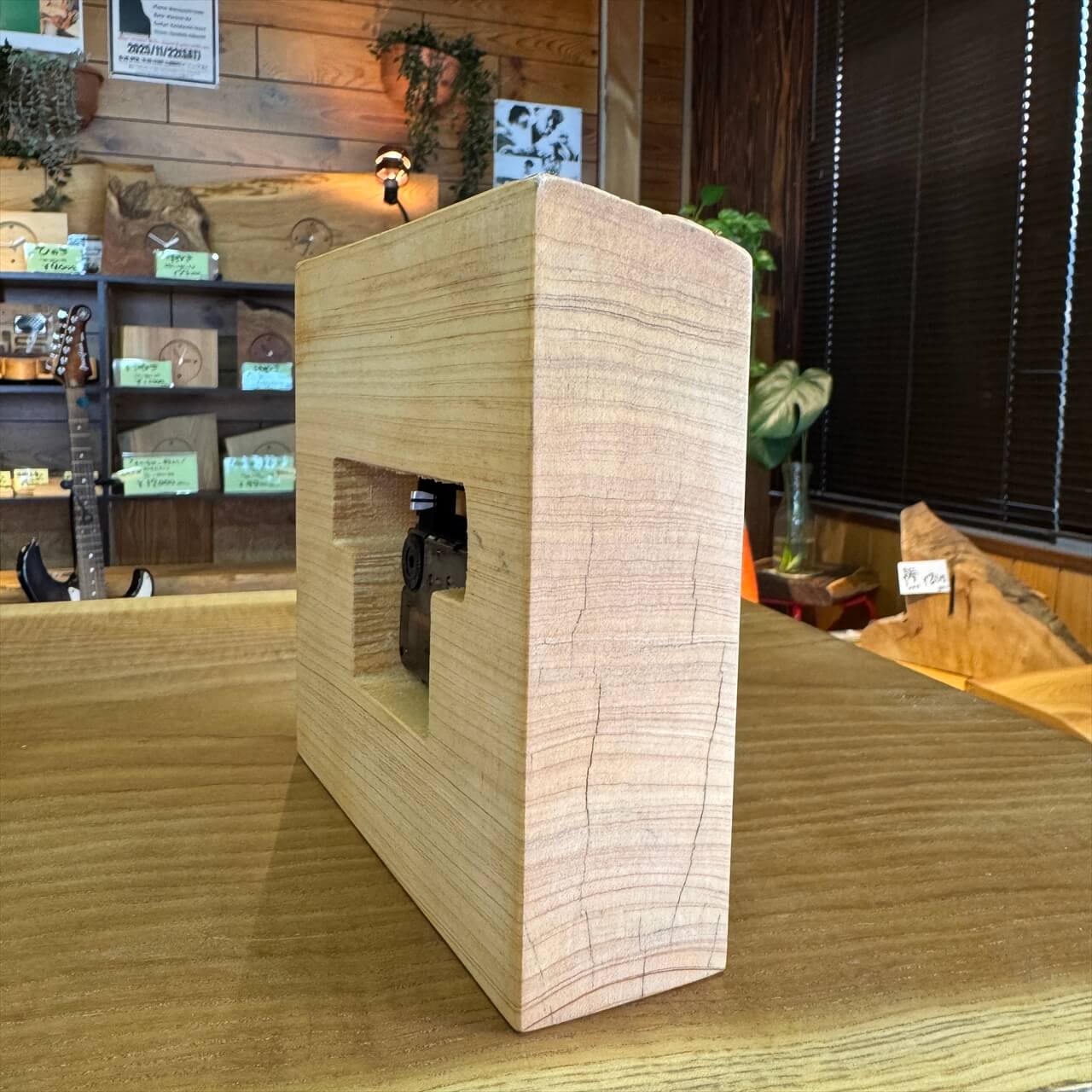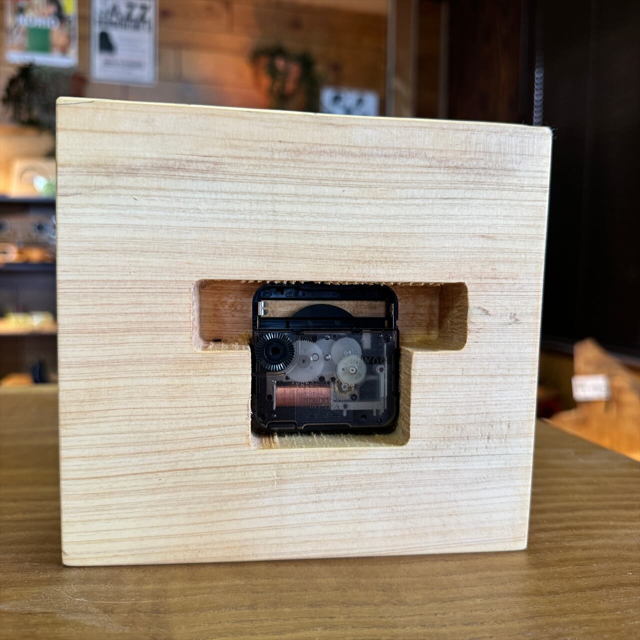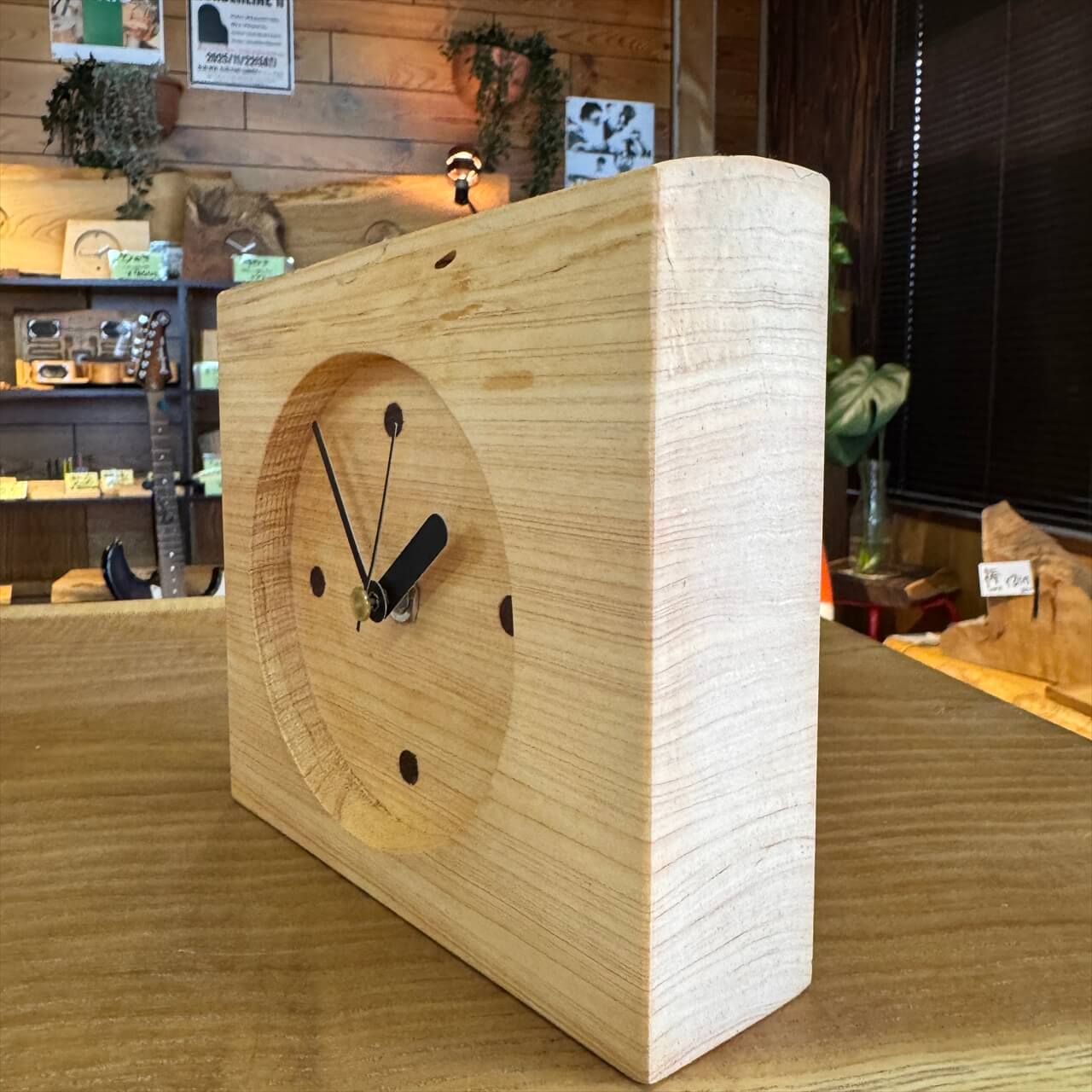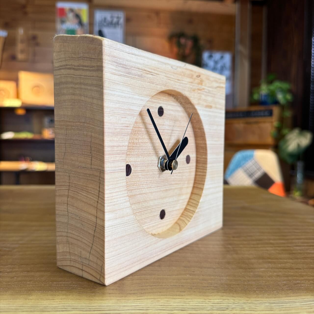 この時計は、製材や家具製作で切り落とされた小さな端材から生まれました。割れや虫穴など、木が歩んできた証をあえて残し、手を加えすぎず自然のままの風合いを大切にしています。デジタル全盛の時代に、アナログ時計が刻むわずかな“ずれ”もまた、暮らしの中の豊かな時間として楽しんでいただけます。