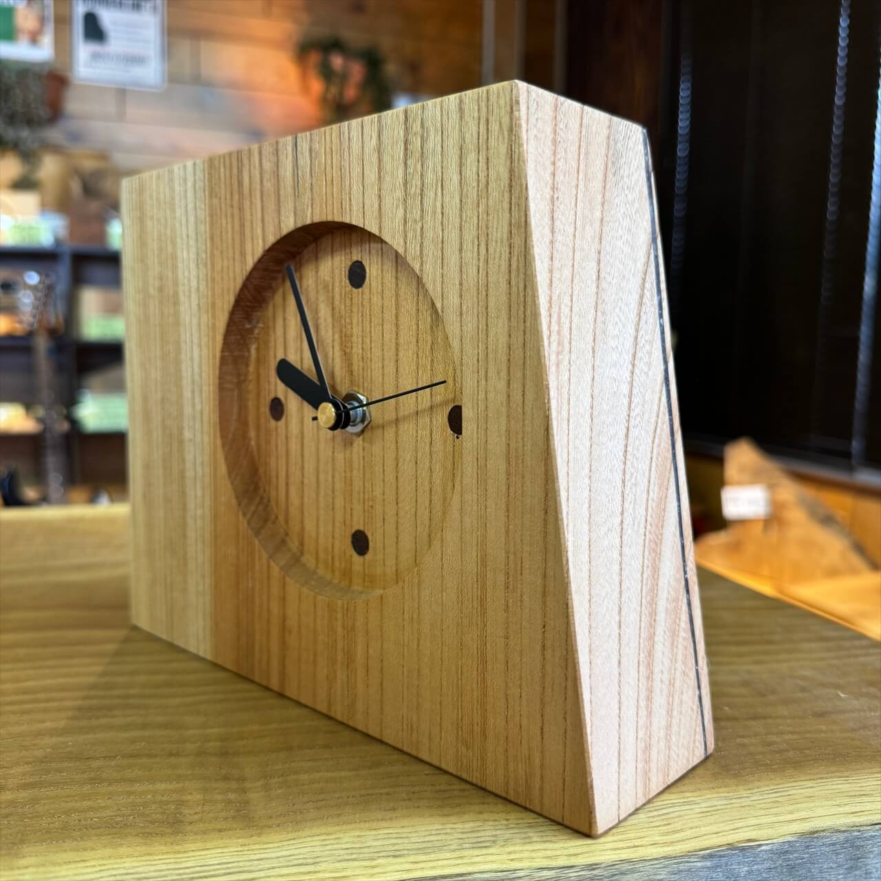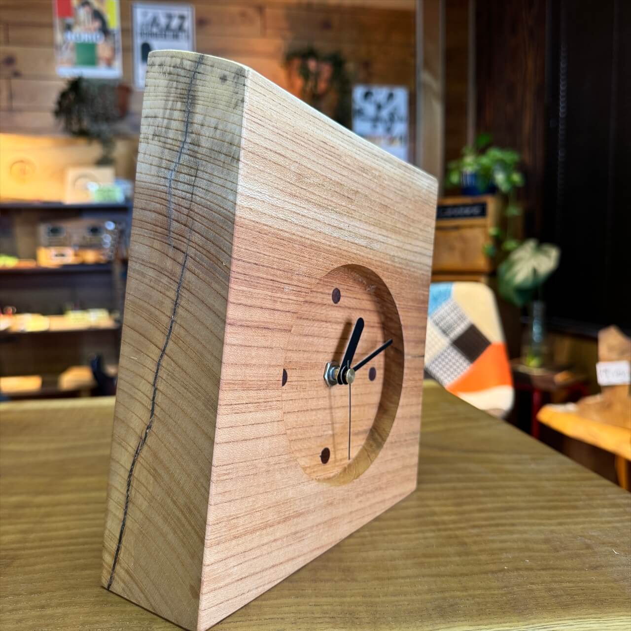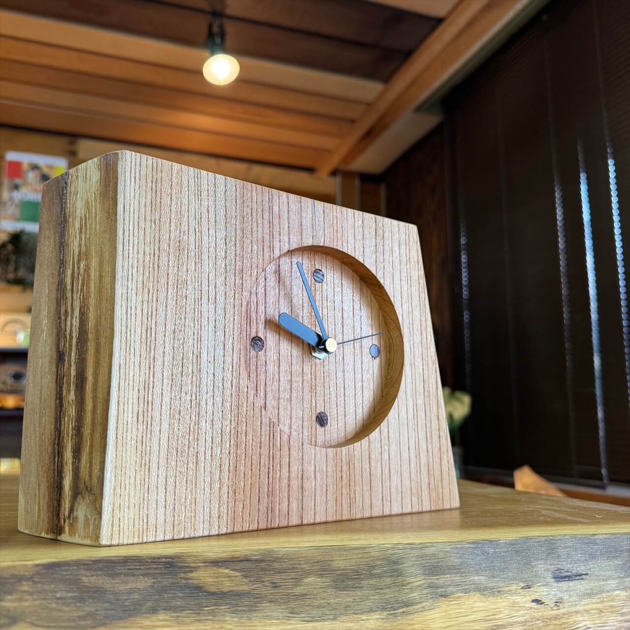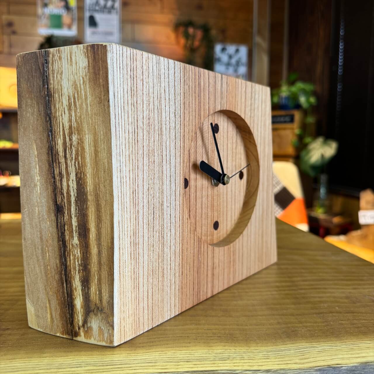 この時計は、製材や家具製作で切り落とされた小さな端材から生まれました。割れや虫穴など、木が歩んできた証をあえて残し、手を加えすぎず自然のままの風合いを大切にしています。デジタル全盛の時代に、アナログ時計が刻むわずかな“ずれ”もまた、暮らしの中の豊かな時間として楽しんでいただけます。