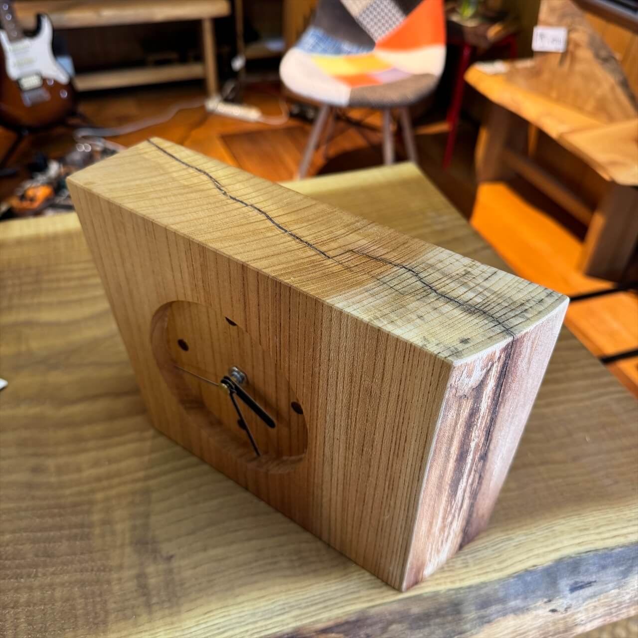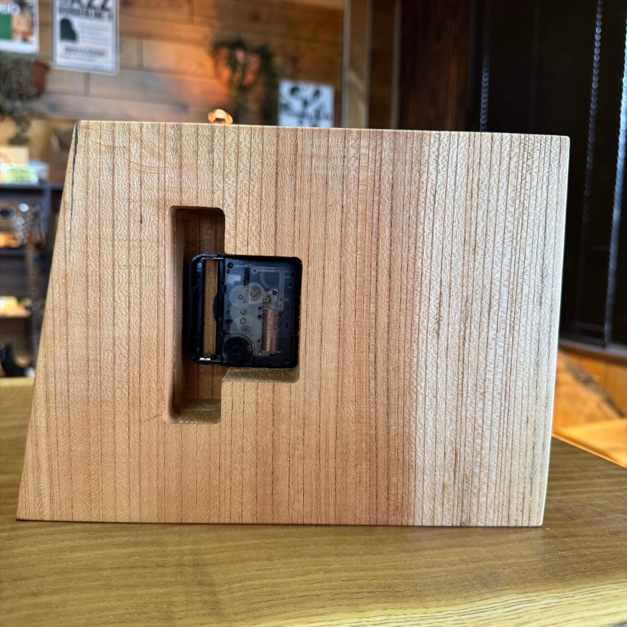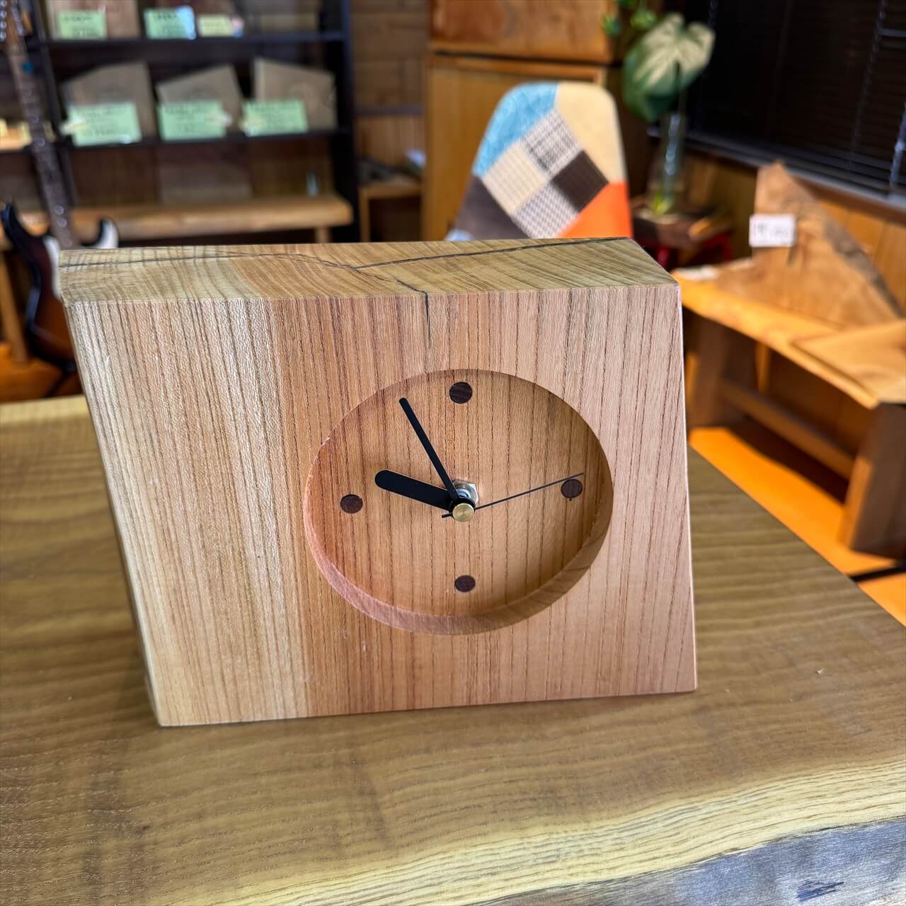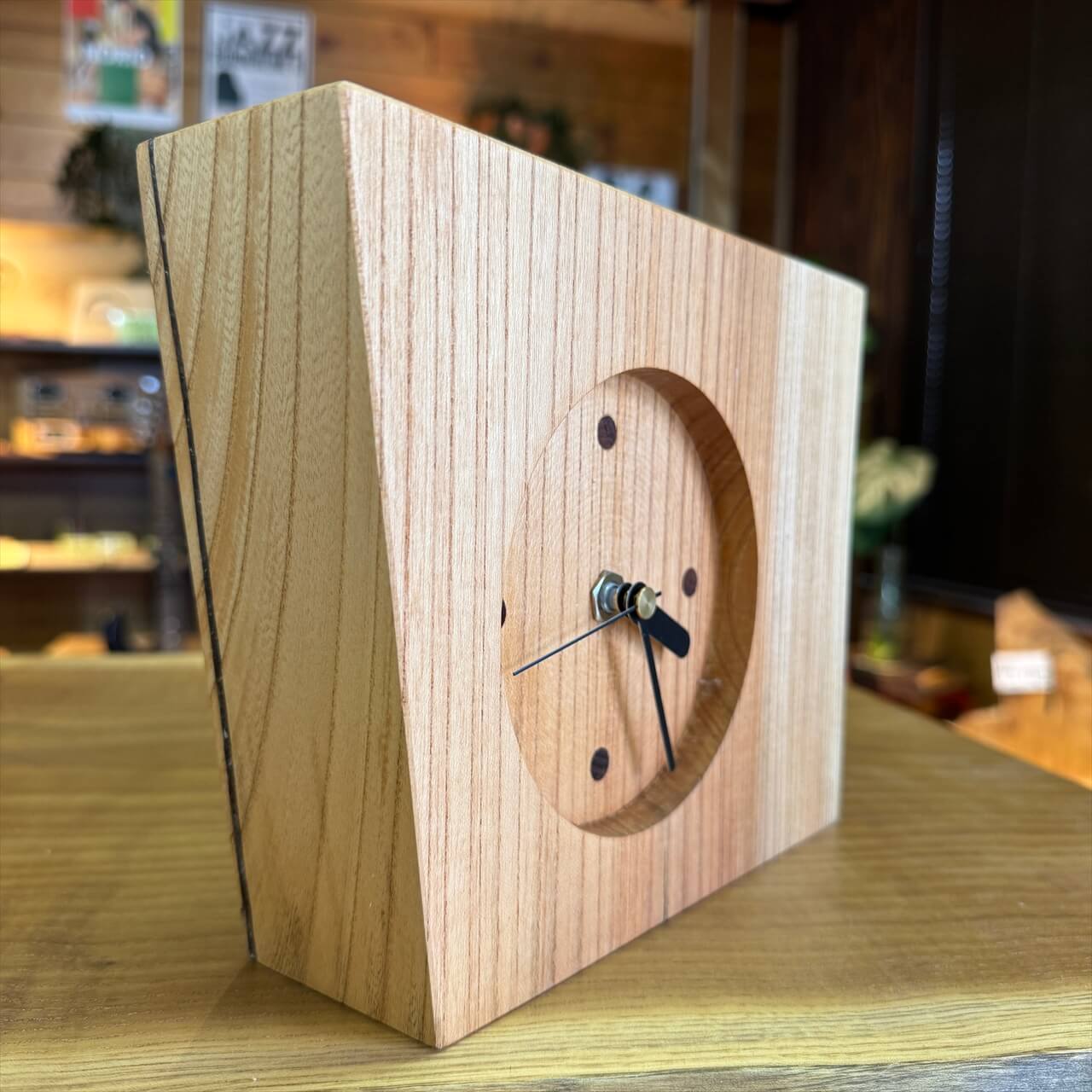 この時計は、製材や家具製作で切り落とされた小さな端材から生まれました。割れや虫穴など、木が歩んできた証をあえて残し、手を加えすぎず自然のままの風合いを大切にしています。デジタル全盛の時代に、アナログ時計が刻むわずかな“ずれ”もまた、暮らしの中の豊かな時間として楽しんでいただけます。