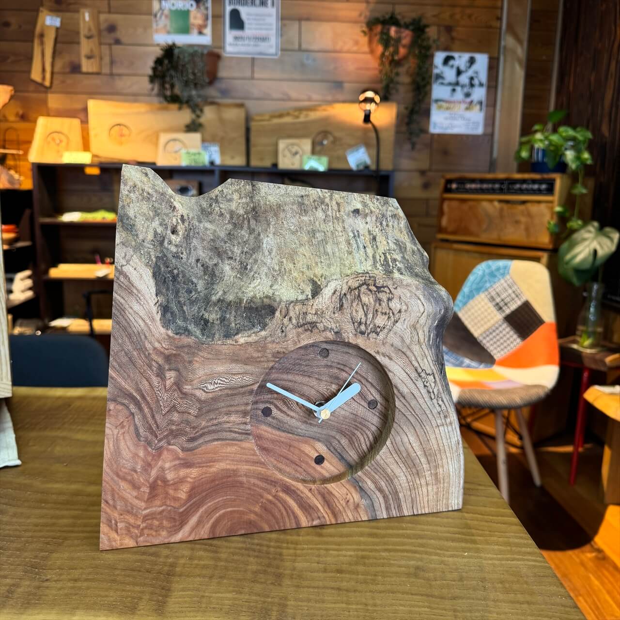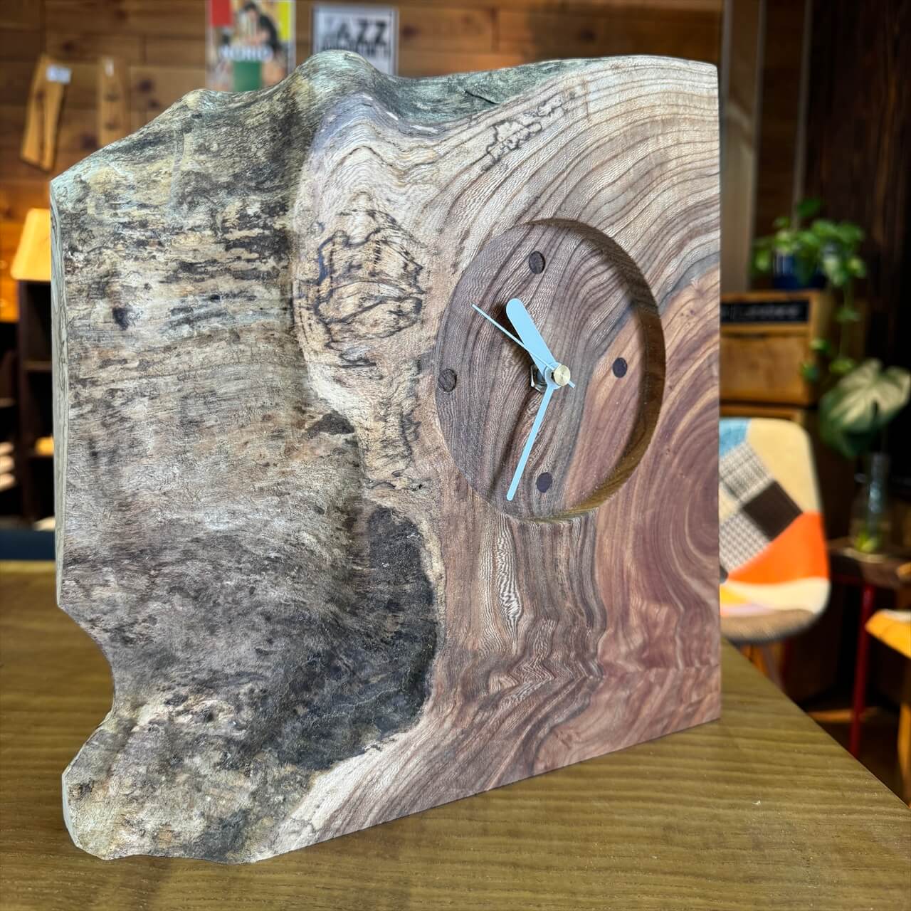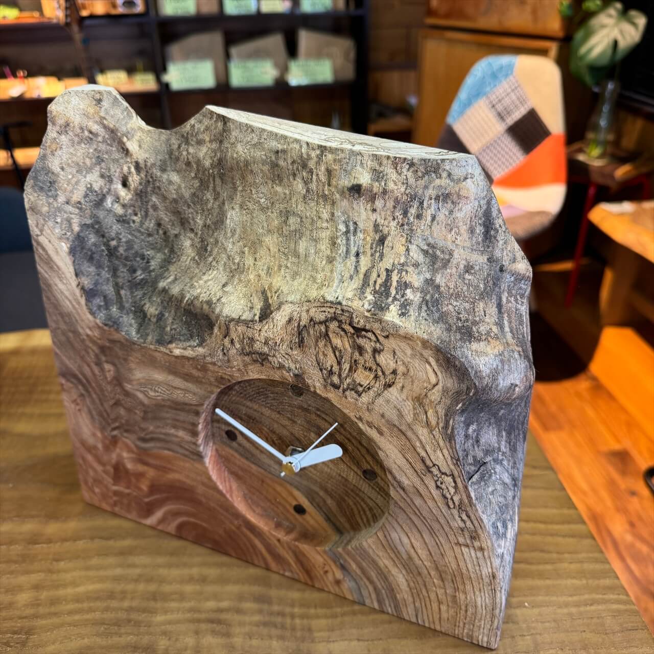この時計は、製材や家具製作で切り落とされた小さな端材から生まれました。割れや虫穴など、木が歩んできた証をあえて残し、手を加えすぎず自然のままの風合いを大切にしています。デジタル全盛の時代に、アナログ時計が刻むわずかな“ずれ”もまた、暮らしの中の豊かな時間として楽しんでいただけます。