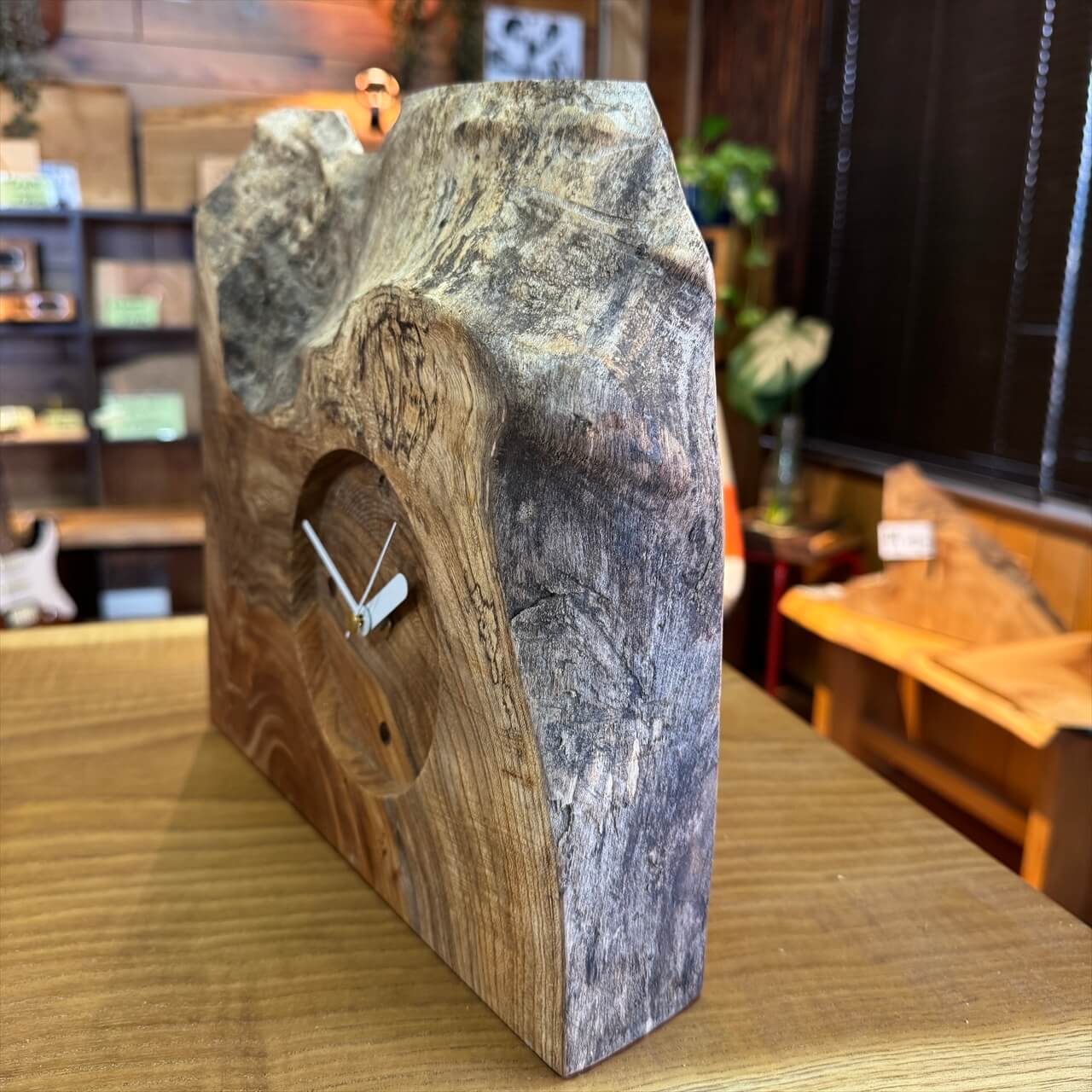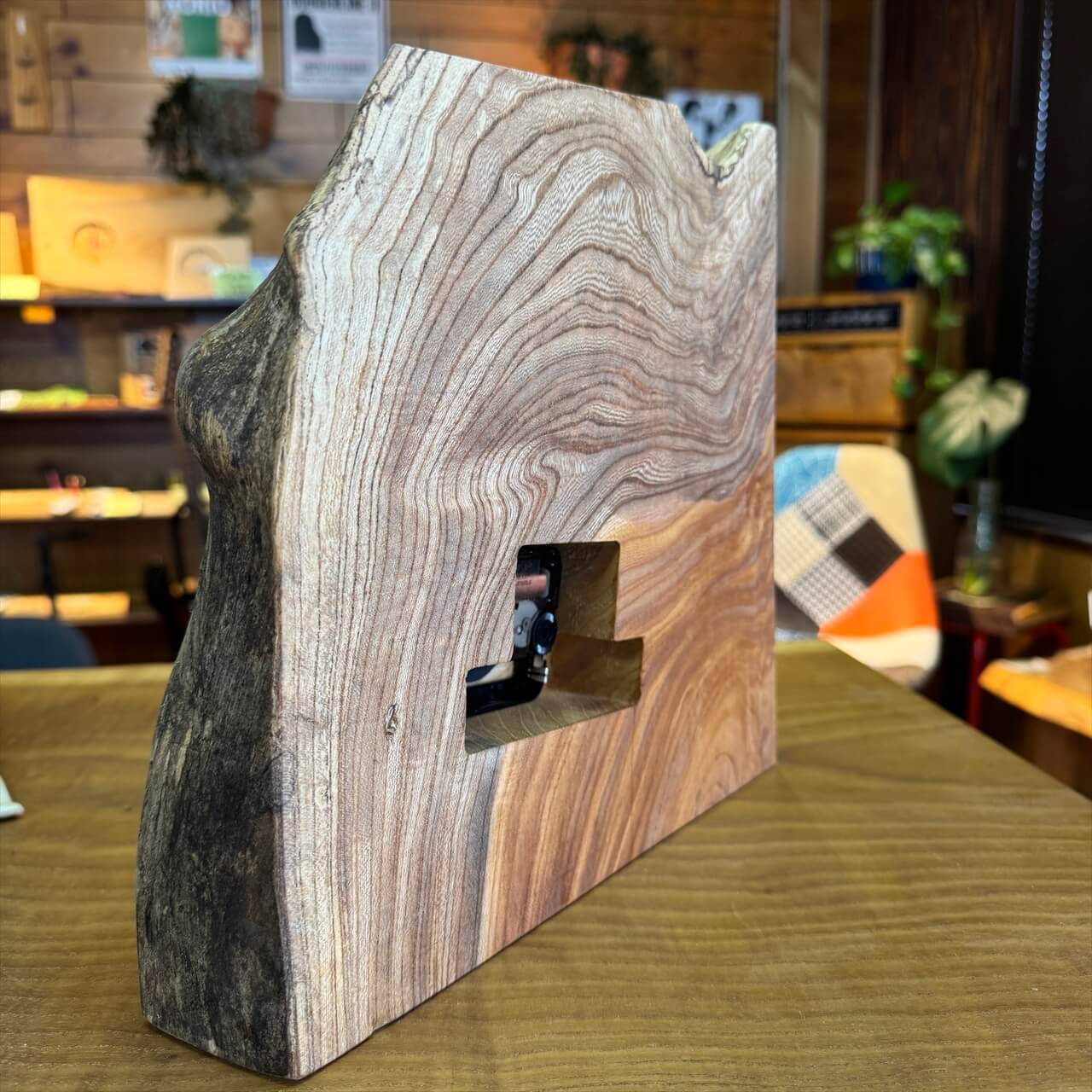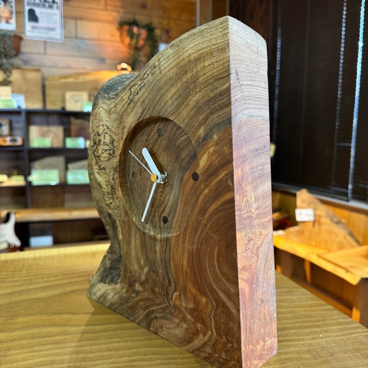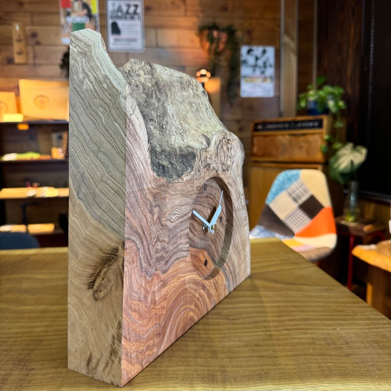 この時計は、製材や家具製作で切り落とされた小さな端材から生まれました。割れや虫穴など、木が歩んできた証をあえて残し、手を加えすぎず自然のままの風合いを大切にしています。デジタル全盛の時代に、アナログ時計が刻むわずかな“ずれ”もまた、暮らしの中の豊かな時間として楽しんでいただけます。