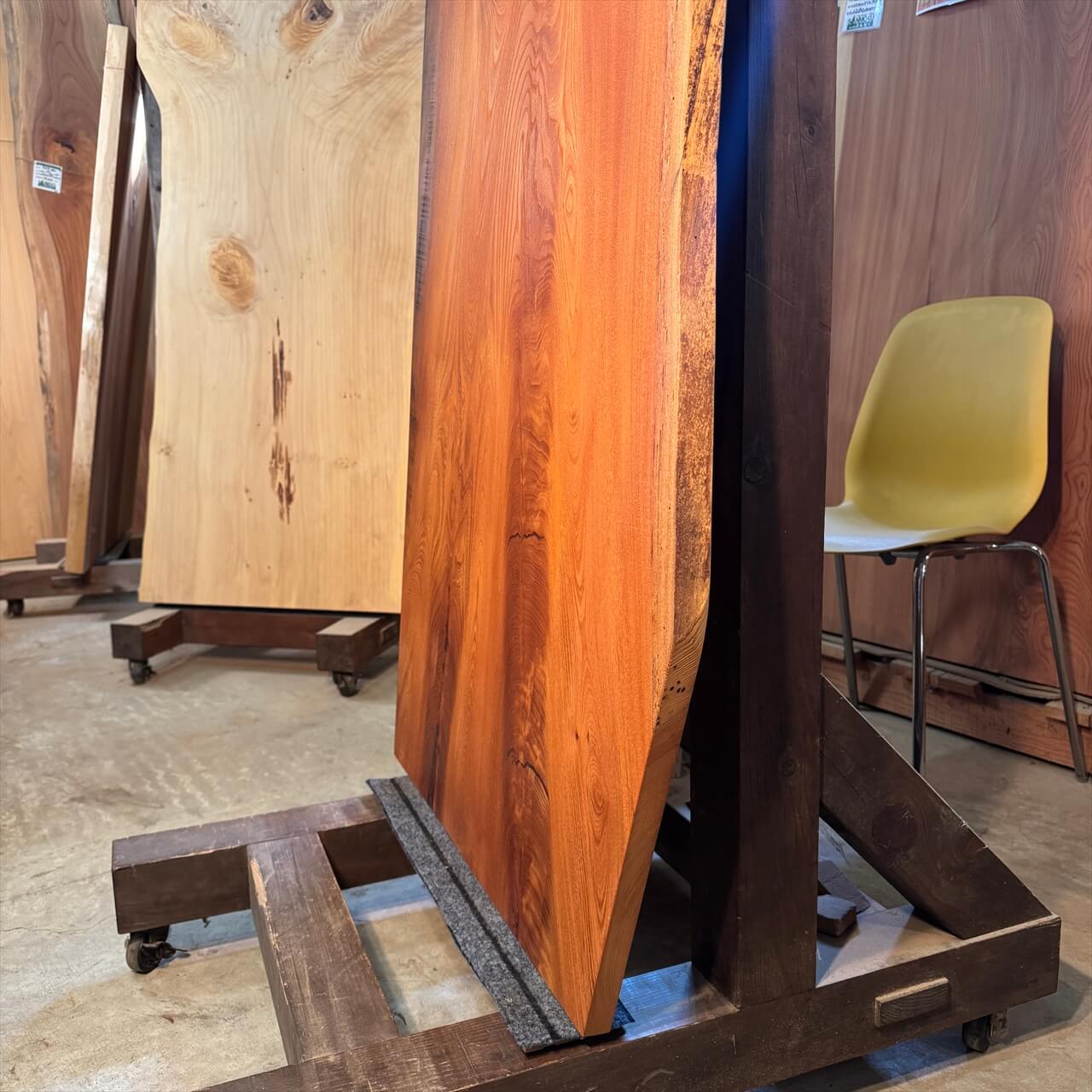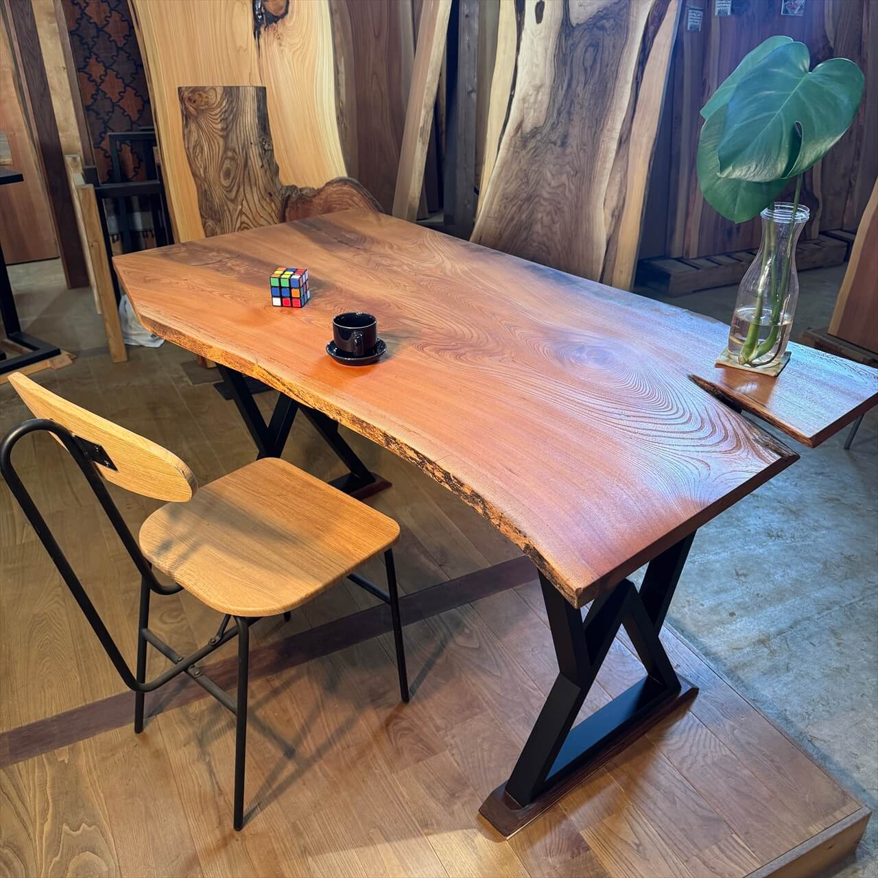 同じものは二度と出ない、まさにな一枚板です。厚みが少し薄目な一枚板ですが、テーブル天板としてはもちろん、空間の主役になる存在感を持った一枚です。